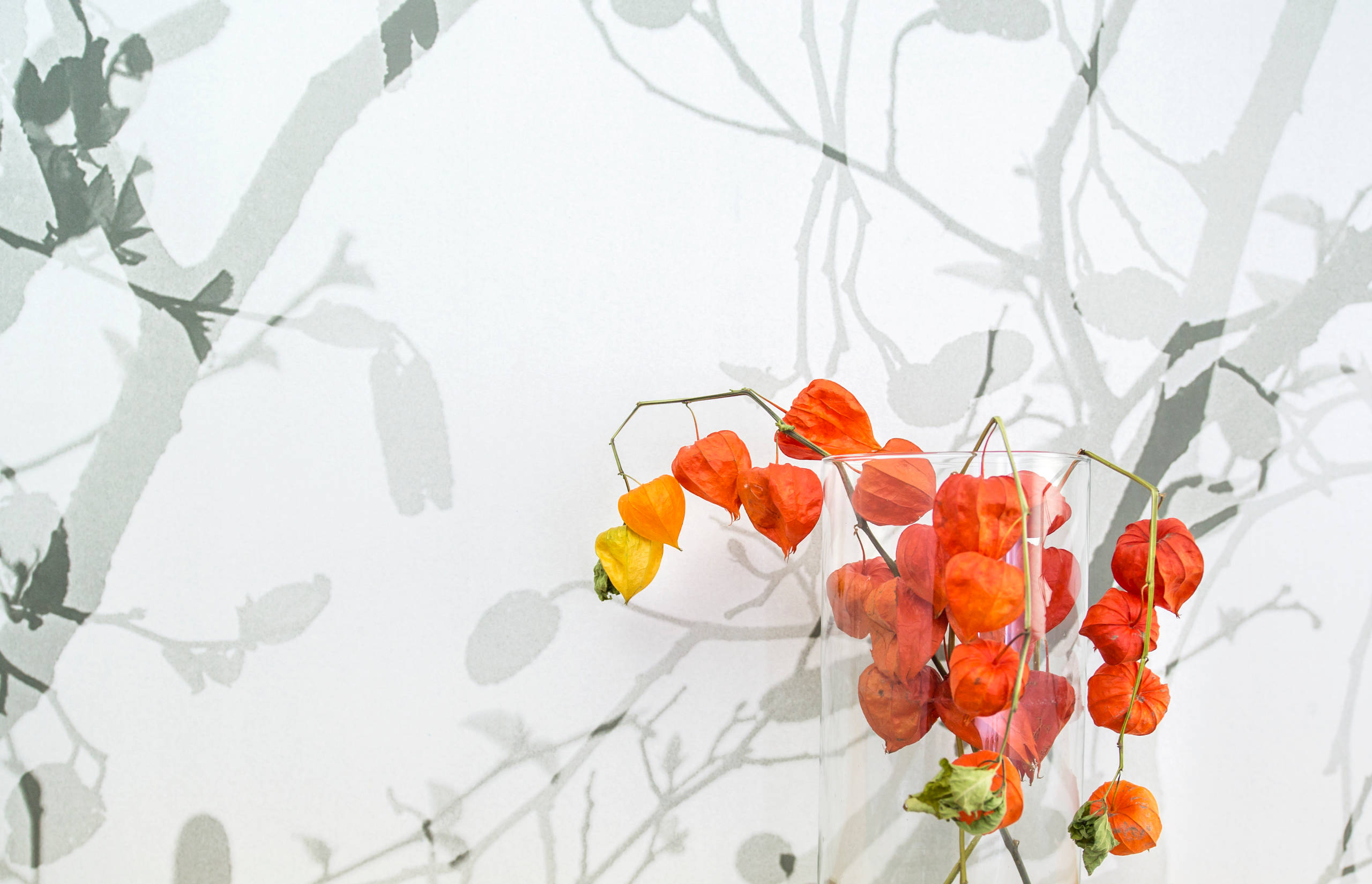 Optisch zurückhaltend, in kühlen Farben, lässt der Raum jetzt Platz für dekorative Farbakzente wie etwa die orangefarbene Lampionblume.