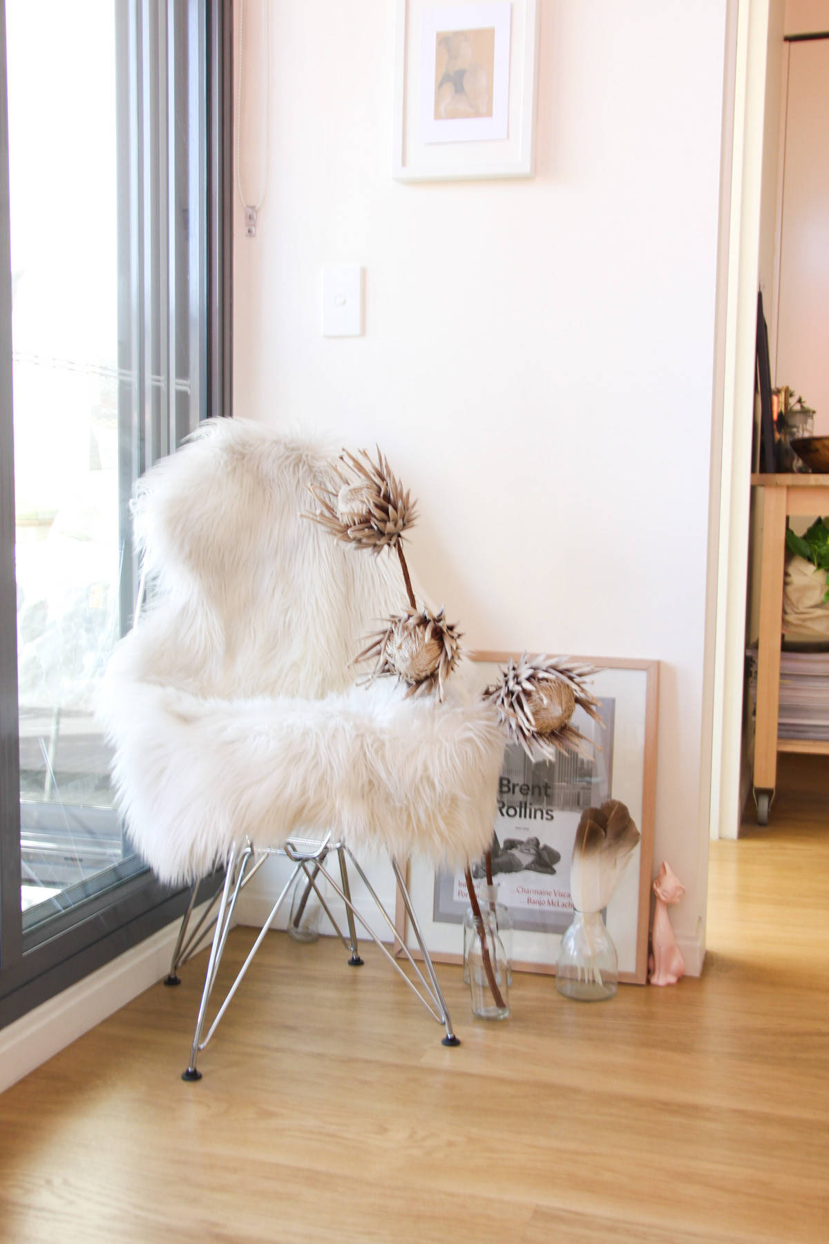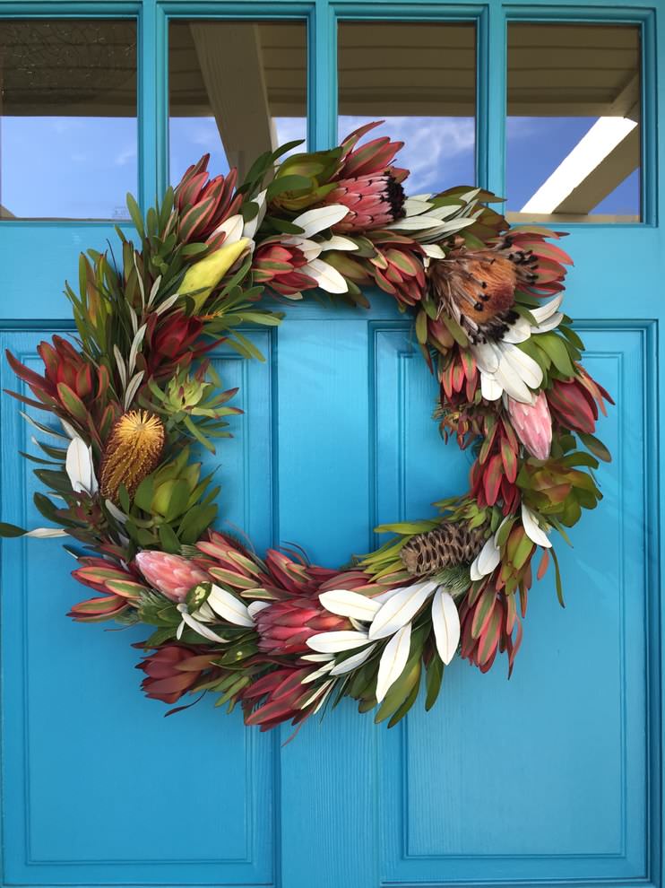 Nicht nur in freier Wildbahn, in einem subtropischen Garten oder in der Vase macht die Kaprose etwas her. Auch in diesem Türkranz kommt die südafrikanische Pflanzenschönheit zum Einsatz. Vielleicht eine exotischen Alternative zu den üblichen Adventskränzen aus Immergrün?