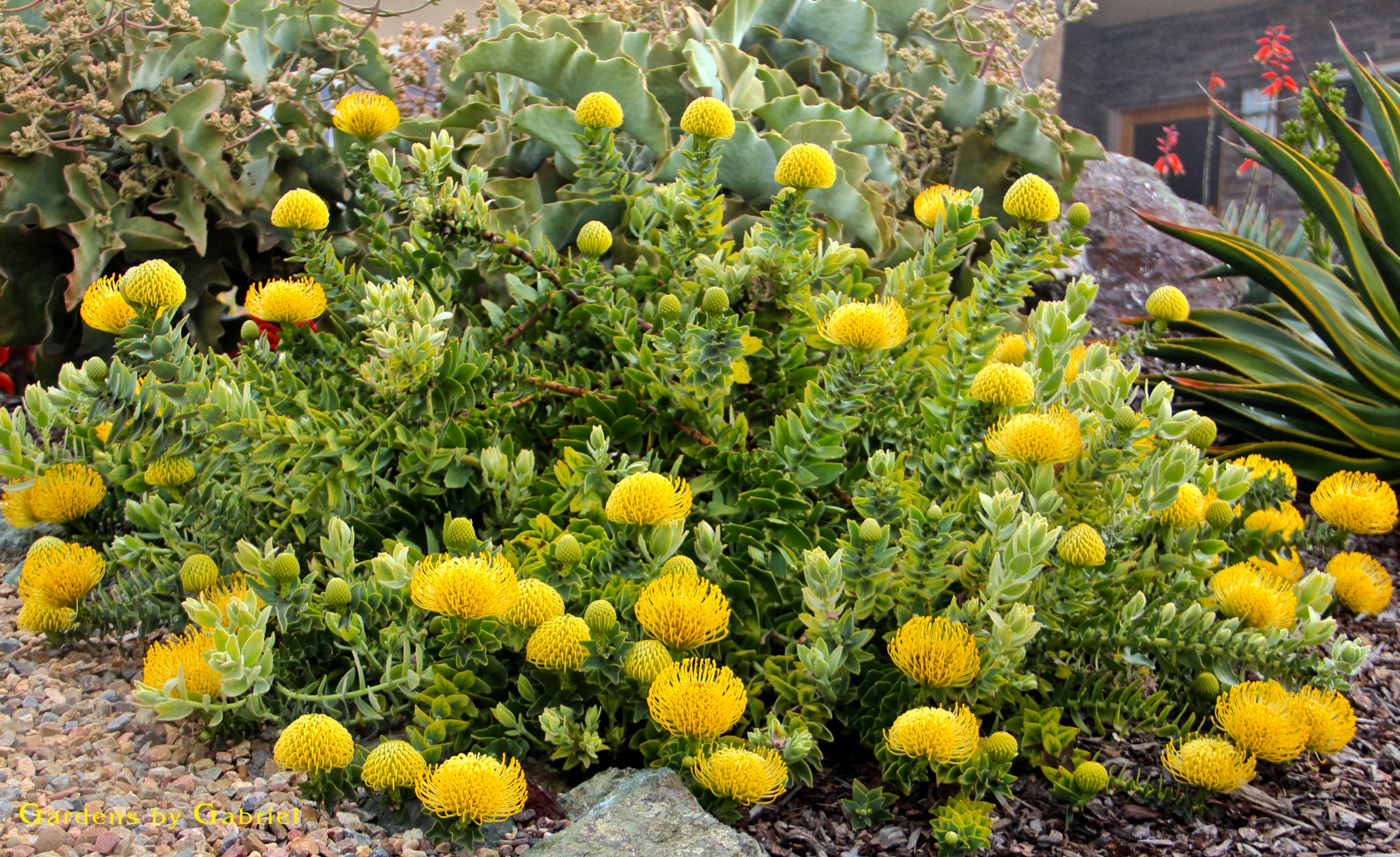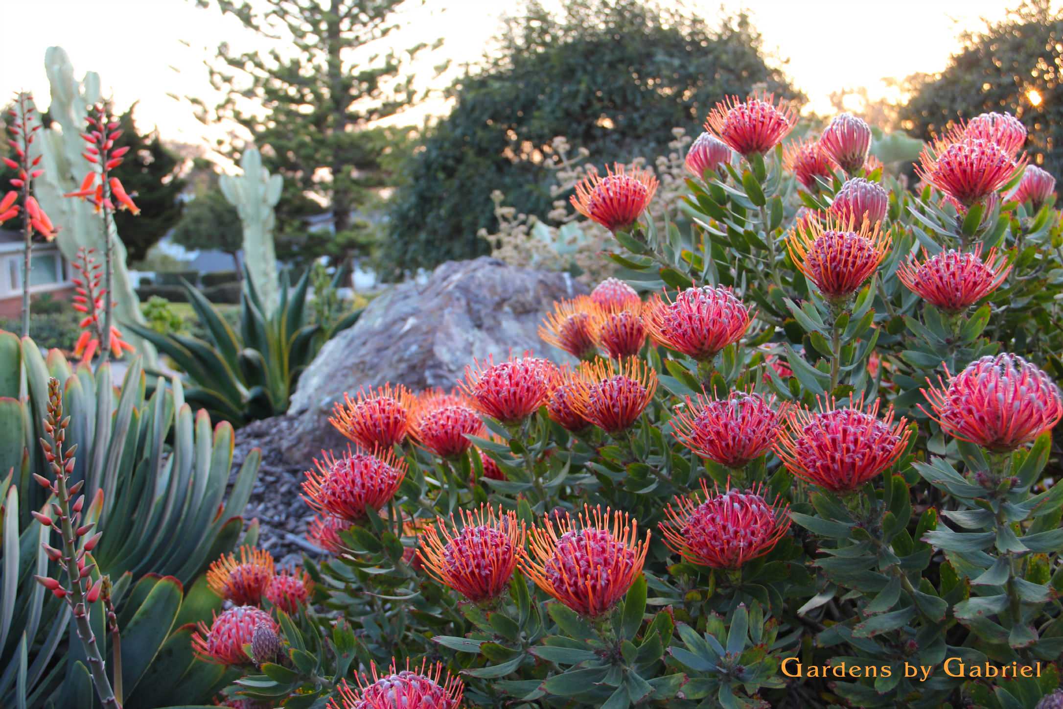 Auch Leucadendron, auf deutsch Silberbaum, Schimmerbaum oder Zapfenbusch genannt, gehört zur Familie der Silberbaumgewächse. Hier wächst die exotische Pflanze in einer kalifornischen Vorgarten-Bepflanzung in Rottönen zusammen mit Phormium ‘Amazing Red’, Anigozanthus ‘Big Red’ und Afrikanischem Lampenputzer-Gras (Pennisetum setaceum).