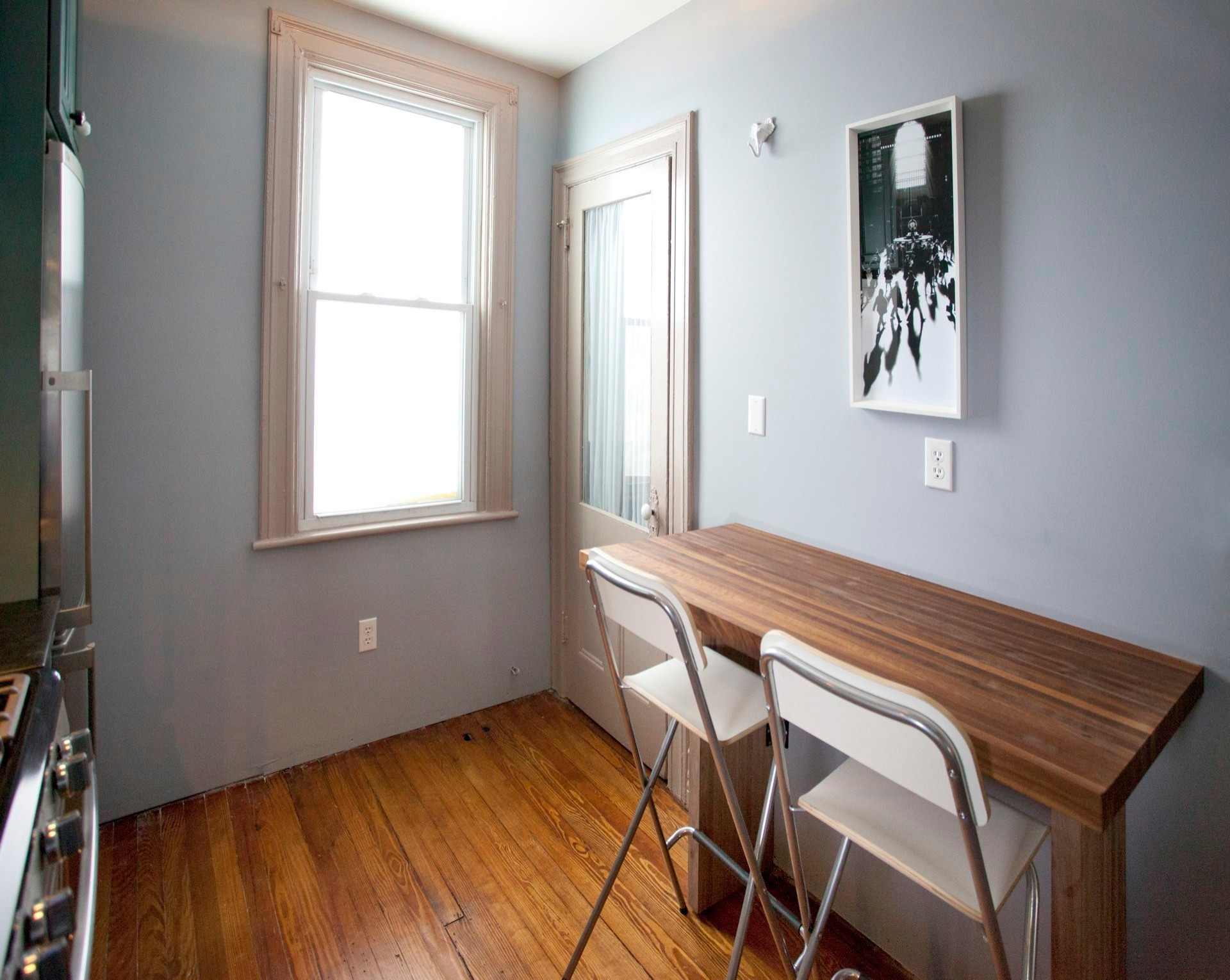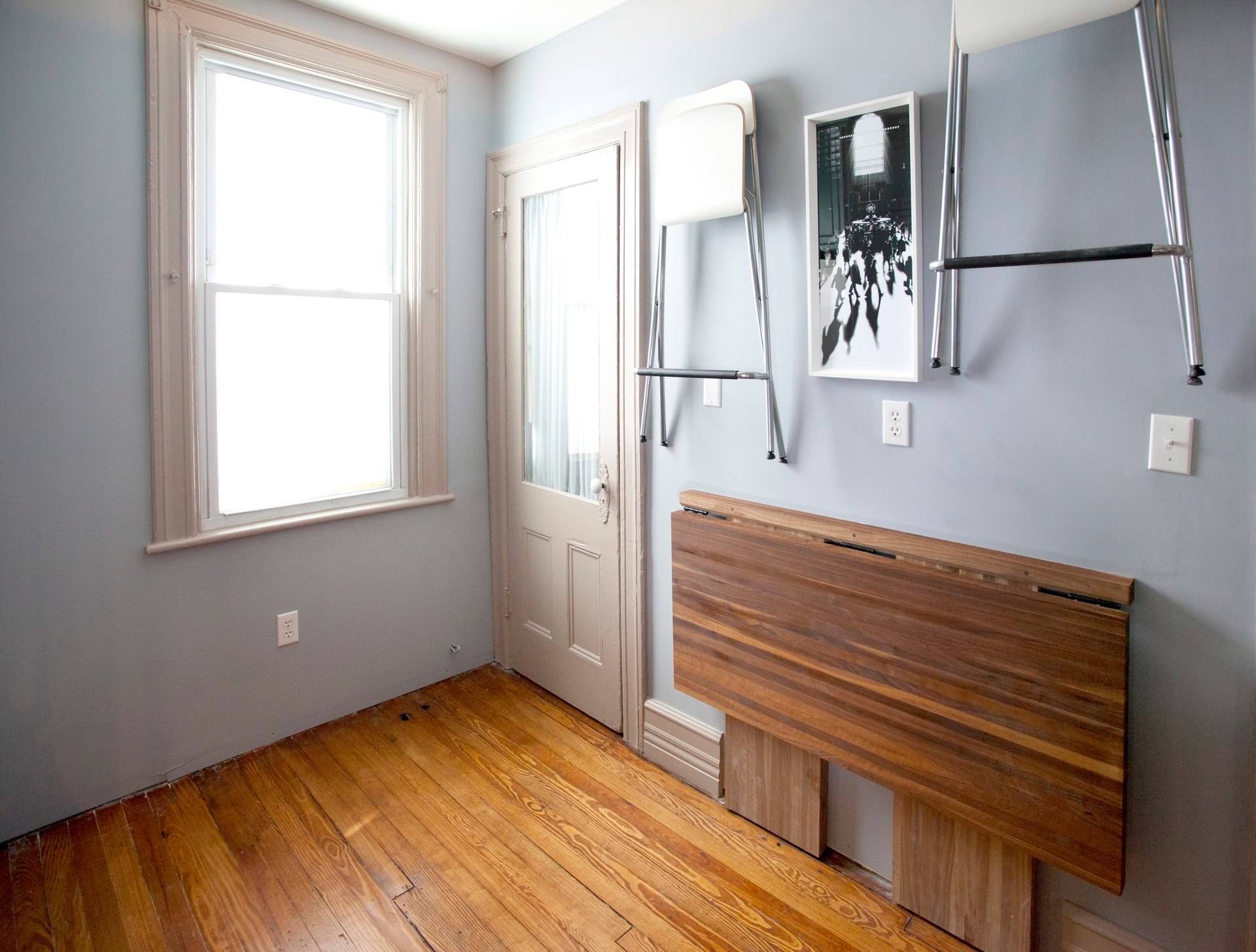 In dieser winzigen Küche finden Esstisch und Stühle kaum Platz. Die Lösung heißt auch hier: Klappen! Der Tisch ist mit Scharnieren an die Wand montiert. Bei Bedarf klappt man die Tischplatte einfach hoch. Die passenden Klappstühle kann man an Haken an die Wand hängen.