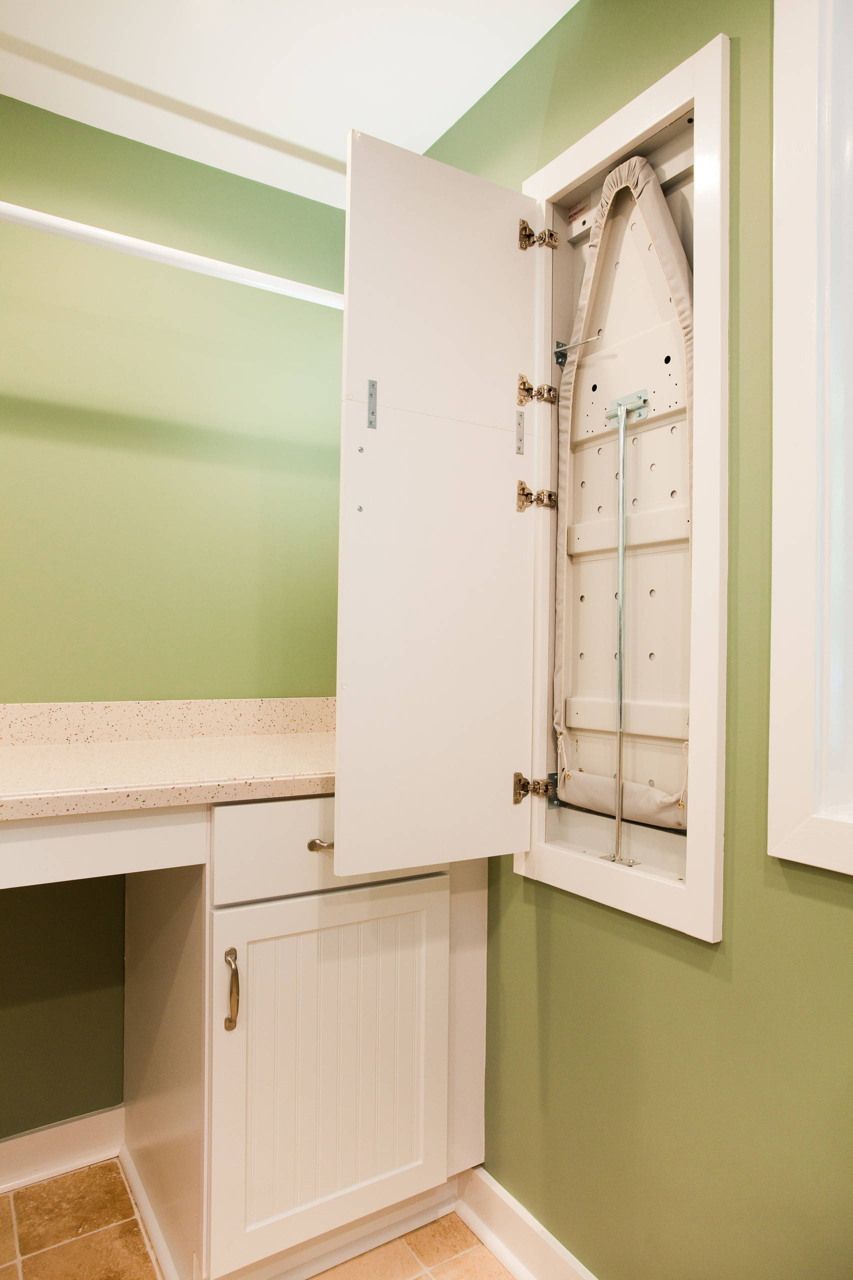 Bügelbretter und Wäscheständer sind nicht ständig in Gebrauch, sollten aber immer griffbereit sein. Der Klappmechanismus stellt auch hier die ideale Lösung dar. An der kurzen Seite ist das Bügelbrett durch Scharniere mit der Wand verbunden und lässt sich einfach ausklappen. Wer bügeln will, der öffne die kleine Tür.