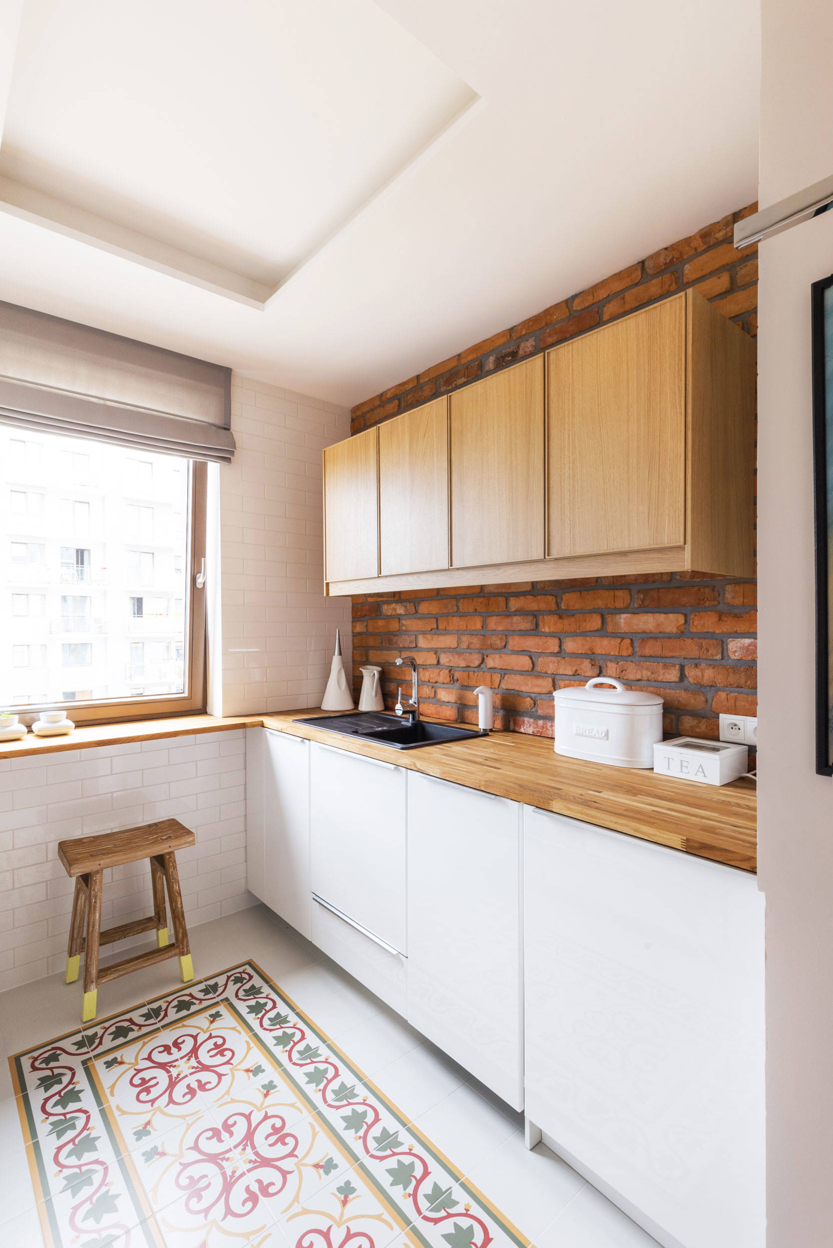 Das Team von Maq Studio hat aus der kleinen Küche einer Wohnung in Polen unter raffiniertem Einsatz von Materialien und Möbeln das Größtmögliche herausgeholt. Die seitlich abgesetzten Küchenoberschränke lassen den Raum größer erscheinen. Durch ihre Ziegelwand im Industrial Style und das mediterrane Teppichmosaik des Küchenbodens erhält die Küche Struktur und Weite.