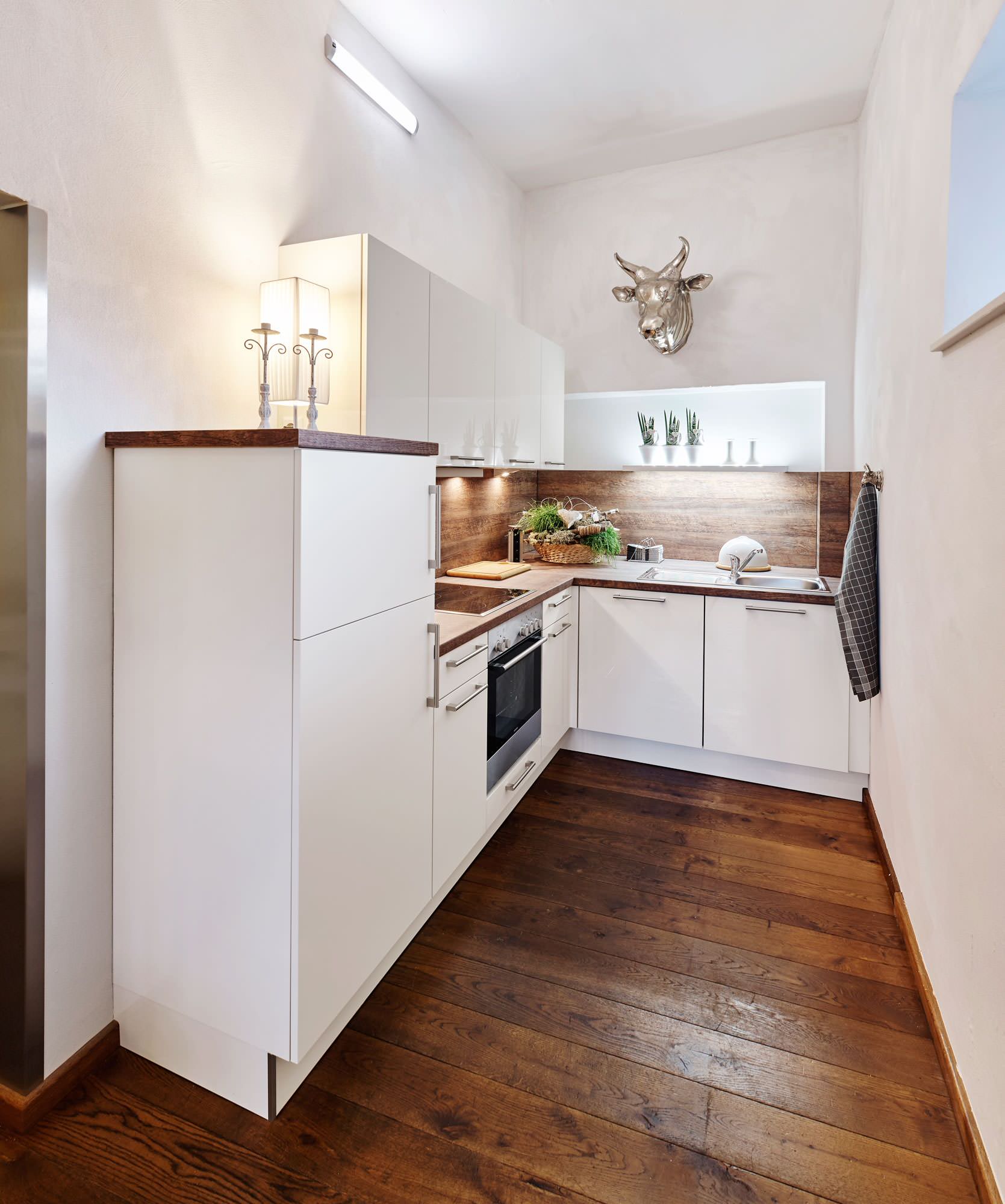 Strahlendes Weiß und dunkles Holz sind eine ungemein gemütliche Kombi. Die Möbelfronten mit weißem Hochglanz-Finish werden durch die geölten Dielen und die farblich abgestimmte Arbeitsfläche und die Rückwand kontrastiert. Die stimmungsvolle indirekte Beleuchtung ergänzt die ländliche Küche einer Ferienwohnung ideal.