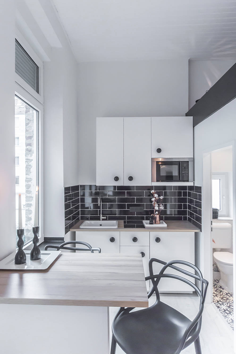 Eine kleine Studiowohnung ganz in Schwarzweiß – passend dazu wurde auch die Pantryküche gestaltet. Ein Spritzschutz aus schwarzen Metro-Fliesen und große schwarze Knäufe setzen Akzente in der sonst hellen Nische. Die Rückwand mit Glanzfinish reflektiert das Licht, wobei der dunkel abgesetzte Bereich zusätzlich Tiefe erzeugt. Es bleibt sogar noch Platz für einen an die Wand gebauten Tresen, der als Küchen-Sitzecke dient