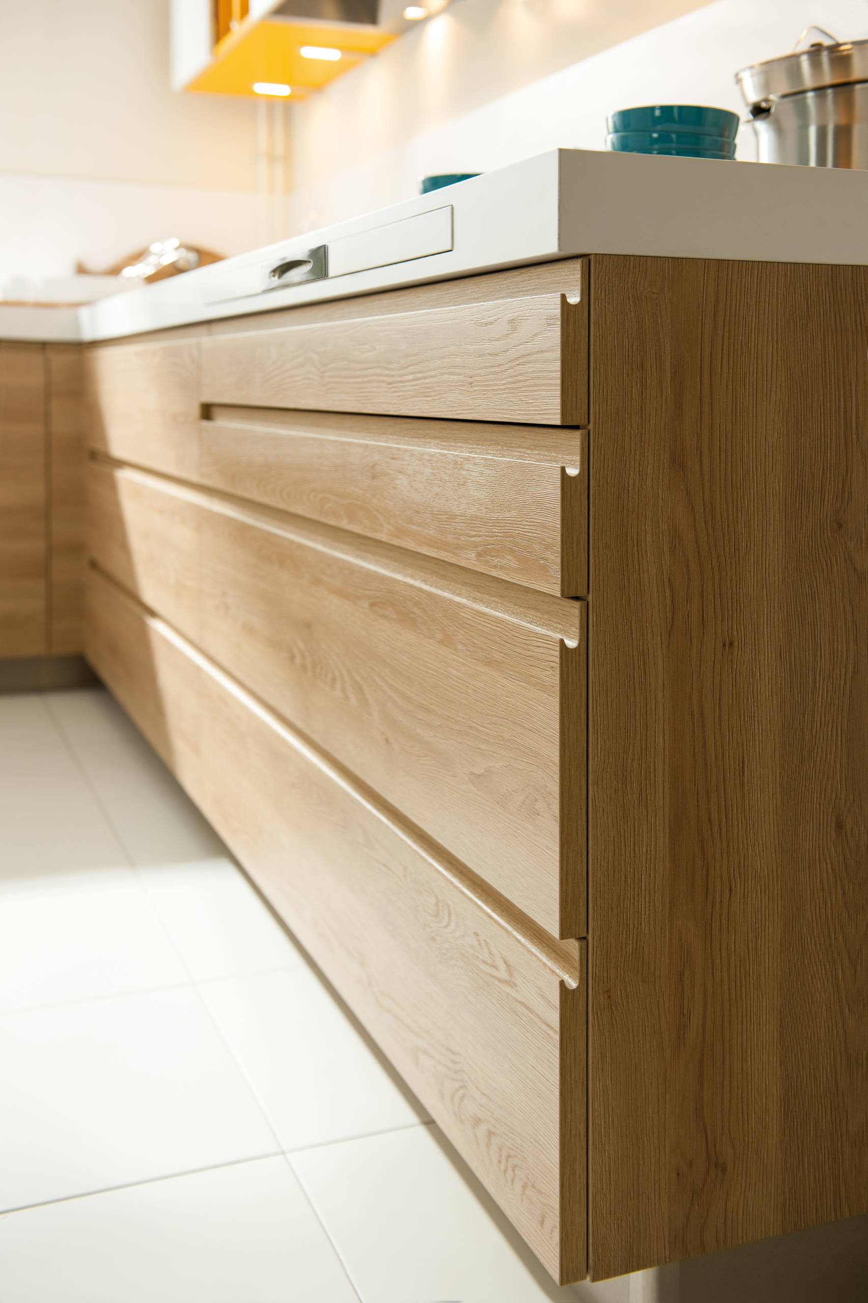 „Geschirr, Gläser, Töpfe und Gewürze können problemlos in direkter Reichweite untergebracht werden. Und mit der Sockeltrittleiter im Fußsystem sind diese Dinge auch ganz leicht zu erreichen“, sagt Produktmanagerin Delphine Pfeiffer.