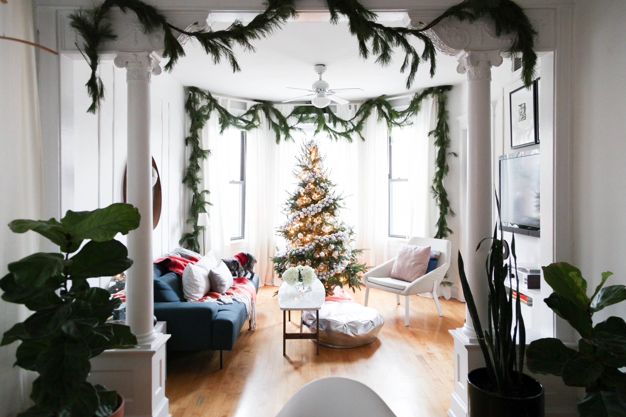 2. Weihnachtlich mit Tannengrün- und Kugelgirlande. Ein richtiger Weihnachtsdschungel aus dunklem Tannengrün ist in diesem Wohnzimmer entstanden. Eine Girlande aus weißen Christbaumkugeln windet sich zudem kunstvoll um den Baum. Festgehalten von: Rachel Loewen Photography