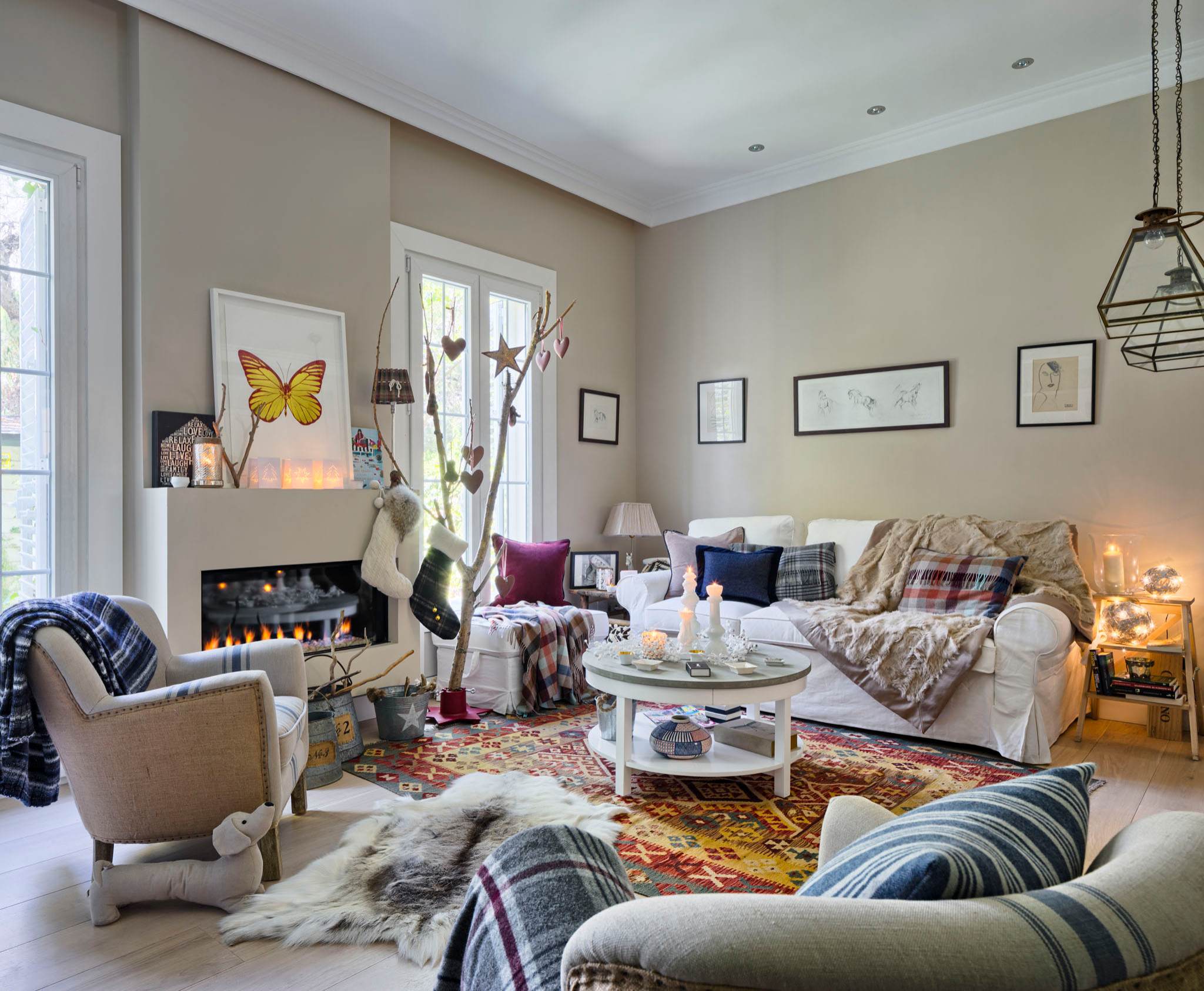 4. Natürlich-festliches Wohnzimmer. Statt eines Weihnachtsbaumes wurde in diesem Wohnzimmer einfach ein großer Ast geschmückt. Karierte Stoffe und viele Lichter laden die ganze Familie zum Sitzen vorm Kamin ein. Gesehen bei: Carolina Verdugo Svensson