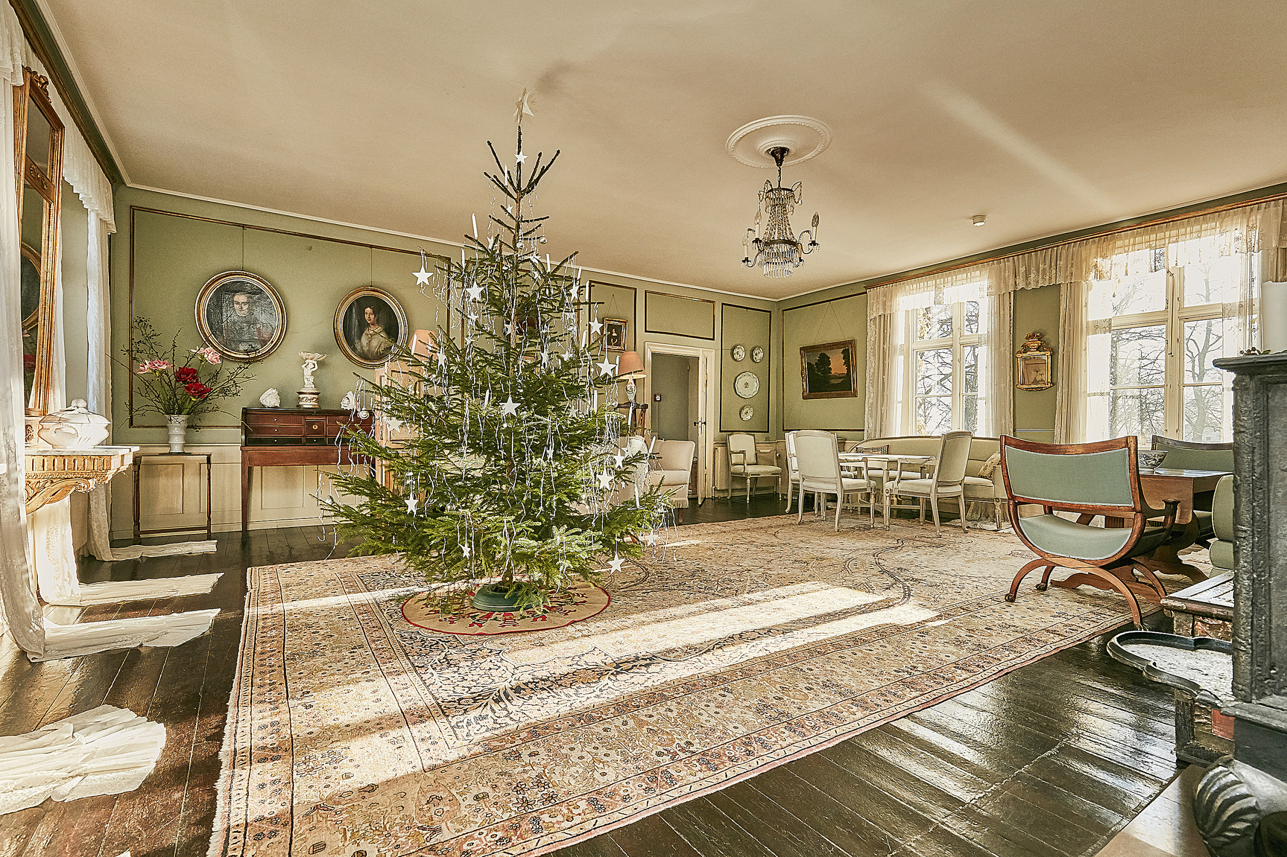 13. Eine Tanne bis unter die Wohnzimmerdecke. Kann ein Weihnachtsbaum eigentlich zu groß sein? Auf dem ehemaligen Landsitz der Baroness und Autorin Karen Blixen („Jenseits von Afrika“) in Rungstedlund, Dänemark, definitiv nicht. Fotografiert von Camilla Ropers