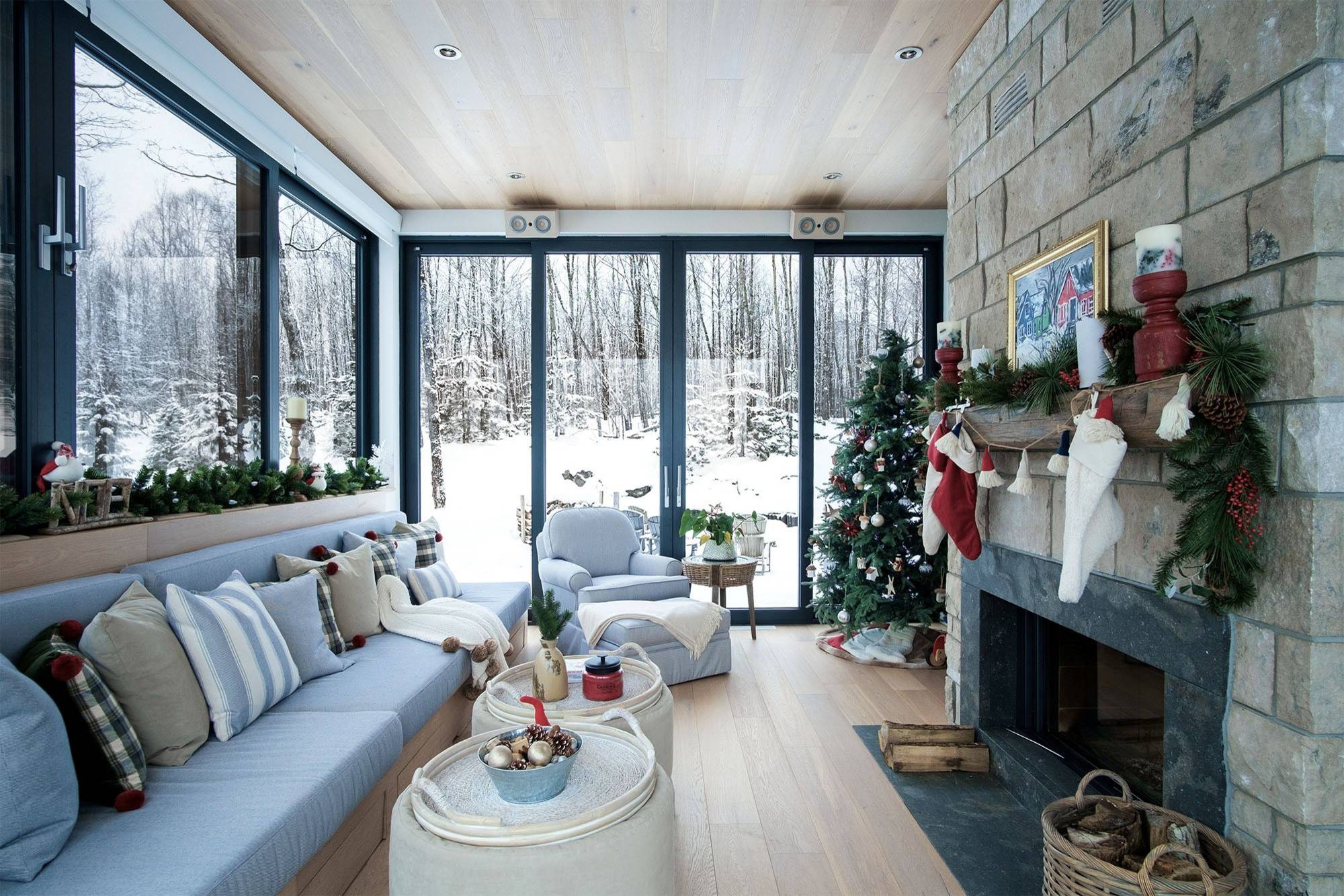 19. Weihnachtliches Wohnzimmer auf dem Land. Funkelnde Lichter drinnen und wirbelnde Schneeflocken draußen: Dieses Wohnzimmer mit Ausblick genießt auch der Vierbeiner der Familie. Gesehen bei: Montpelier Joinery Ltd