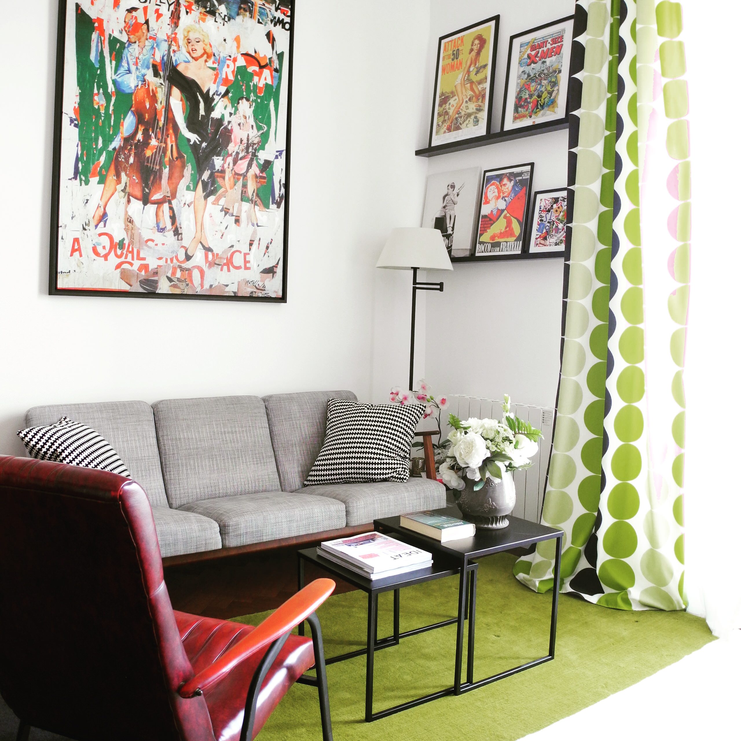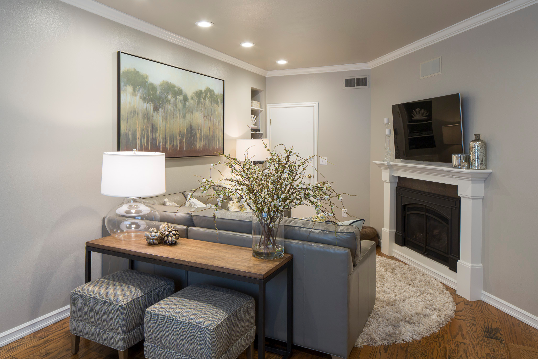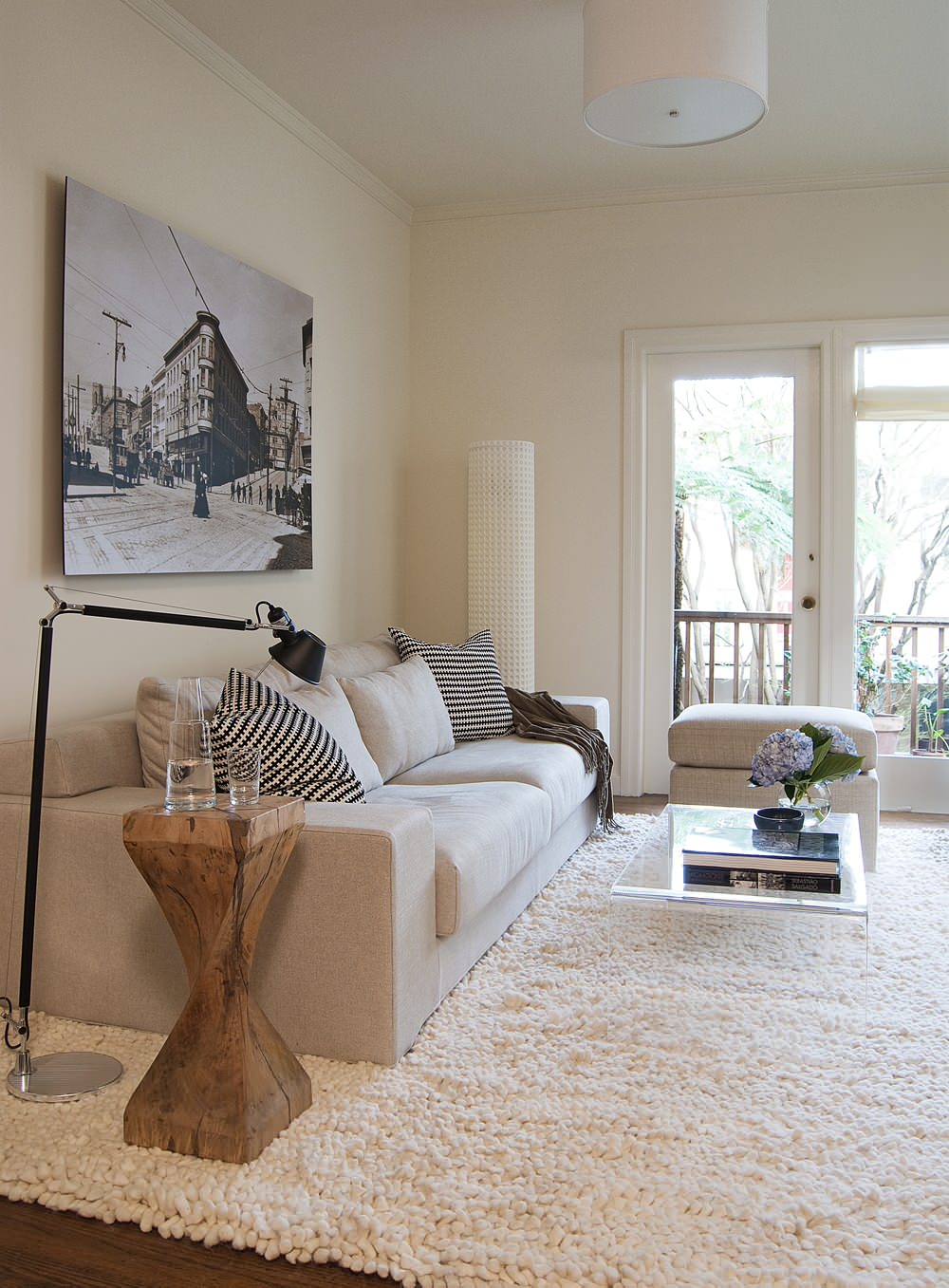 In kleinen Wohnzimmern muss nicht auf Kunst verzichtet werden. Gemälde oder Drucke, die den Großteil einer Wand einnehmen, können einen Raum sogar größer erscheinen lassen. Hohe Bilder und Vorhänge strecken den Raum optisch und lassen ihn weniger gedrungen wirken.