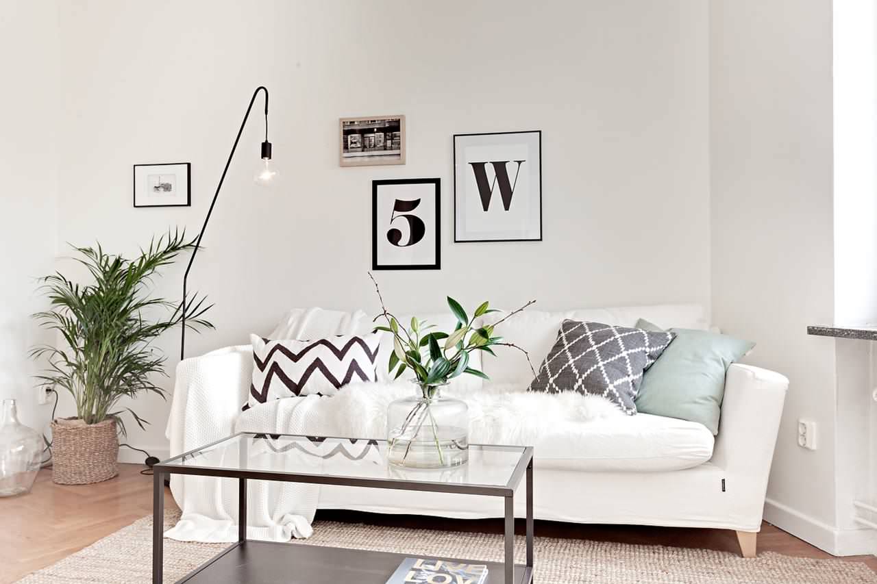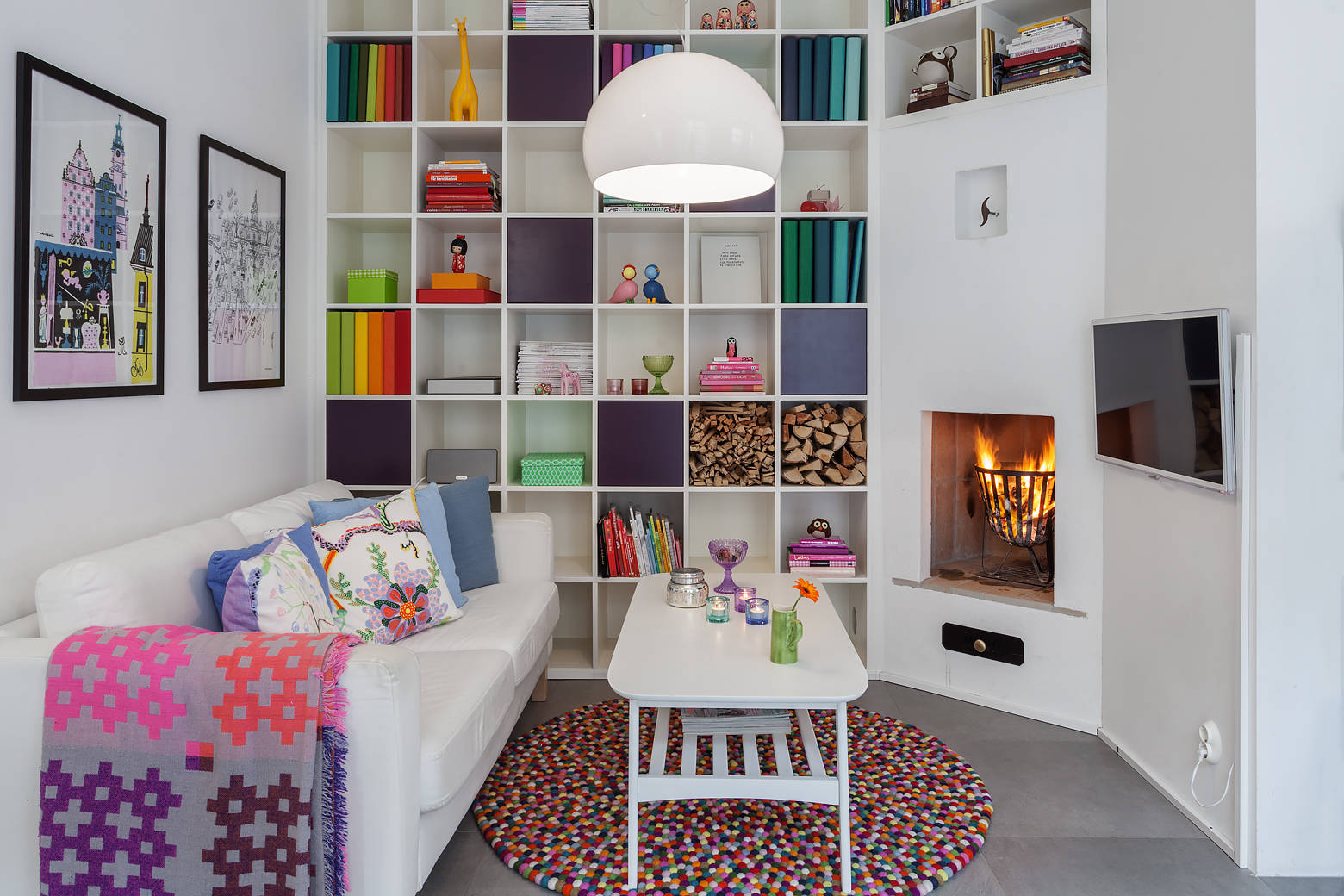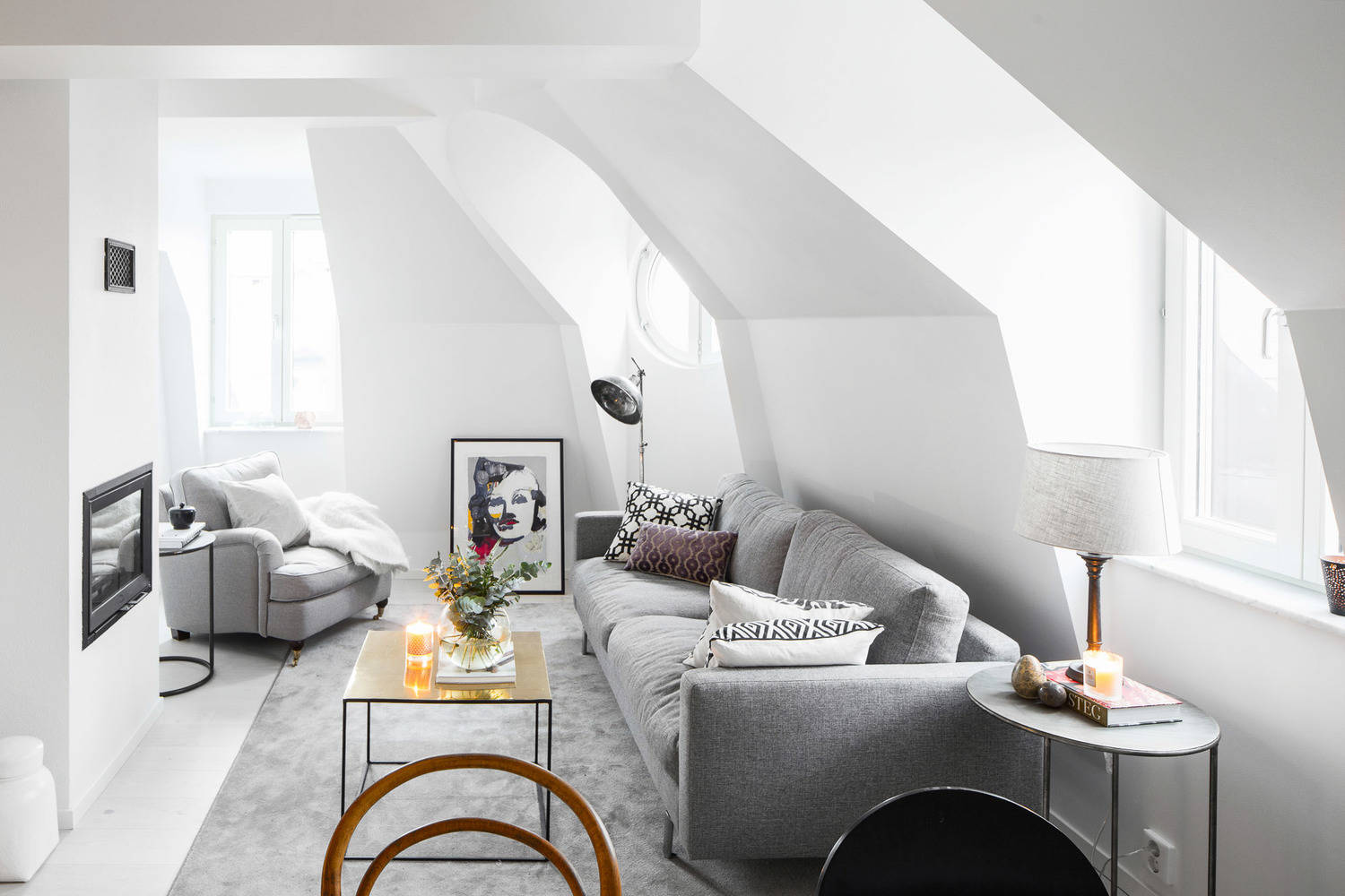Bei der Gestaltung von Räumen stellt sich in der Regel zuerst die Frage nach der passenden Farbgestaltung. Das Wohnzimmer bietet sich eigentlich für Experimente mit satten, warmen Farben an, in kleinen Räumen sollten jedoch zugunsten eines freundlichen und ruhigen Gesamtbildes lieber helle und zurückhaltende Töne gewählt werden. Die Wände dieses Stockholmer Apartments sind in strahlendem Weiß gehalten. So ist es darin trotz Dachschräge nicht zu düster. Ein graues Sofa und ein Teppich in derselben Farbe erzeugen einen sanften Kontrast, ohne den Raum zu verdunkeln. Was natürlich nicht heißt, dass nicht mit Deko in kräftigen Farben Akzente gesetzt werden dürfen.