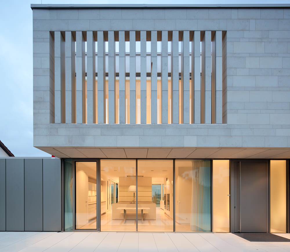 Nach dem gleichen Prinzip funktionieren auch Lamellenkonstruktionen aus Stein. Durch ihr Material wirken sie gröber und massiver. Bei diesem Haus in Weinheim beschattet das auskragende Obergeschoss zugleich die großzügige Verglasung im Erdgeschoss. Die Architekten von Wannenmacher + Möller haben hier den Sonnen- und Sichtschutz dazu genutzt, der gesamten Fassade eine einheitliche Form zu gegeben.