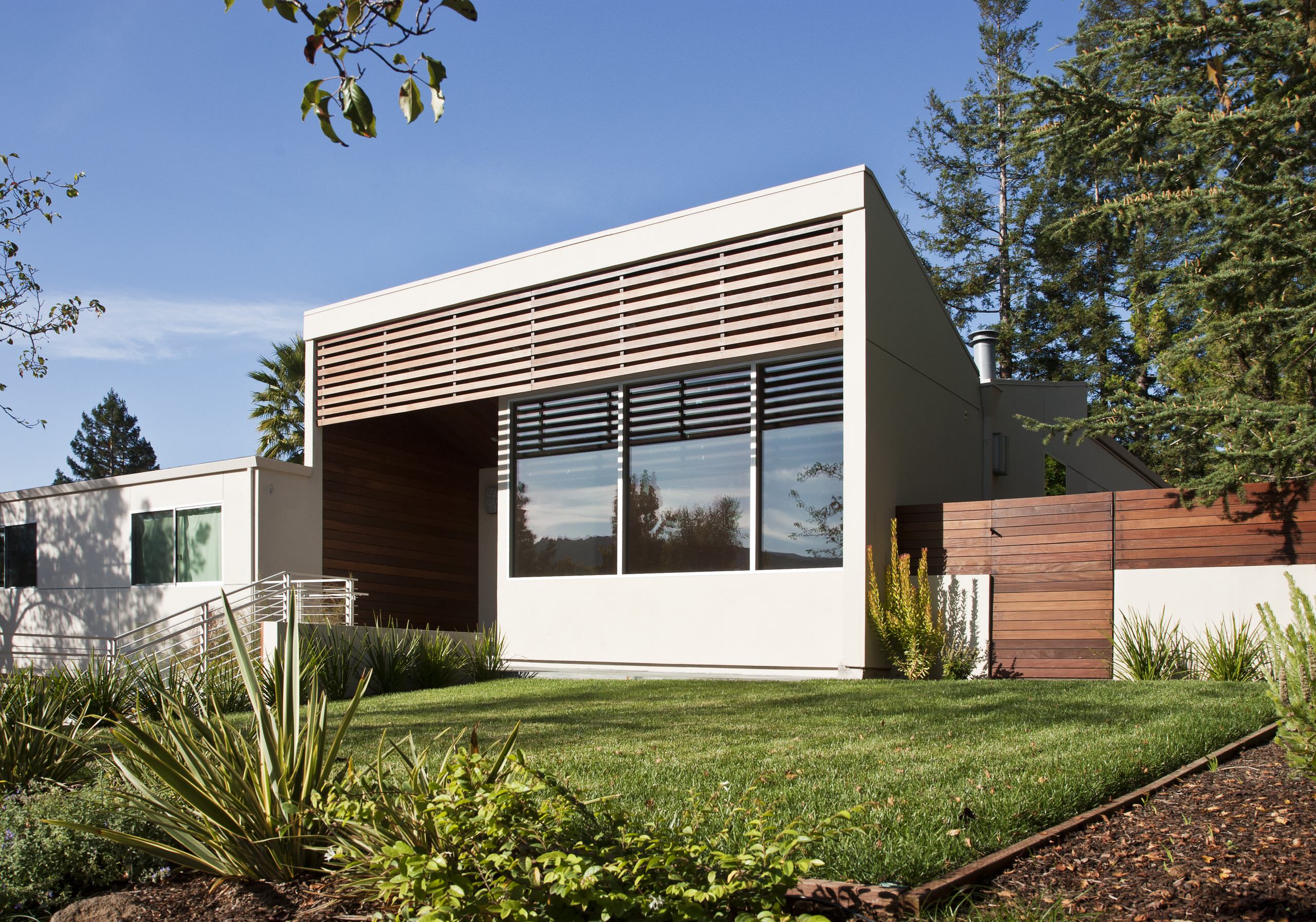 Denselben Effekt bieten die vor dem oberen Teil der Fenster angebrachten Holzlatten in diesem Beispiel in San Francisco. Sie sind mit ein wenig Abstand zu den Fenstern angebracht und wirken wie ein nur halb herabgelassenes Rollo.