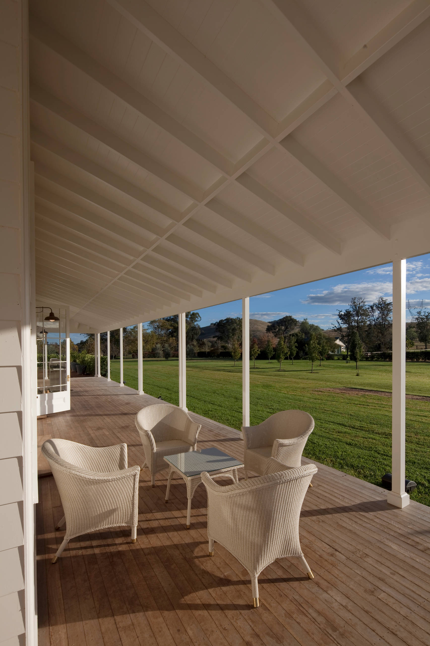 ► Überdachung. Ein weit über die Fensterfront hinausreichendes Dach bietet ebenfalls Sonnenschutz. Von zwei Seiten räumlich gefasst, entsteht so in New South Wales, Australien, eine Art Außenzimmer mit atemberaubendem Panoramablick. Ein luftiger, sommerlicher Wohnraum.