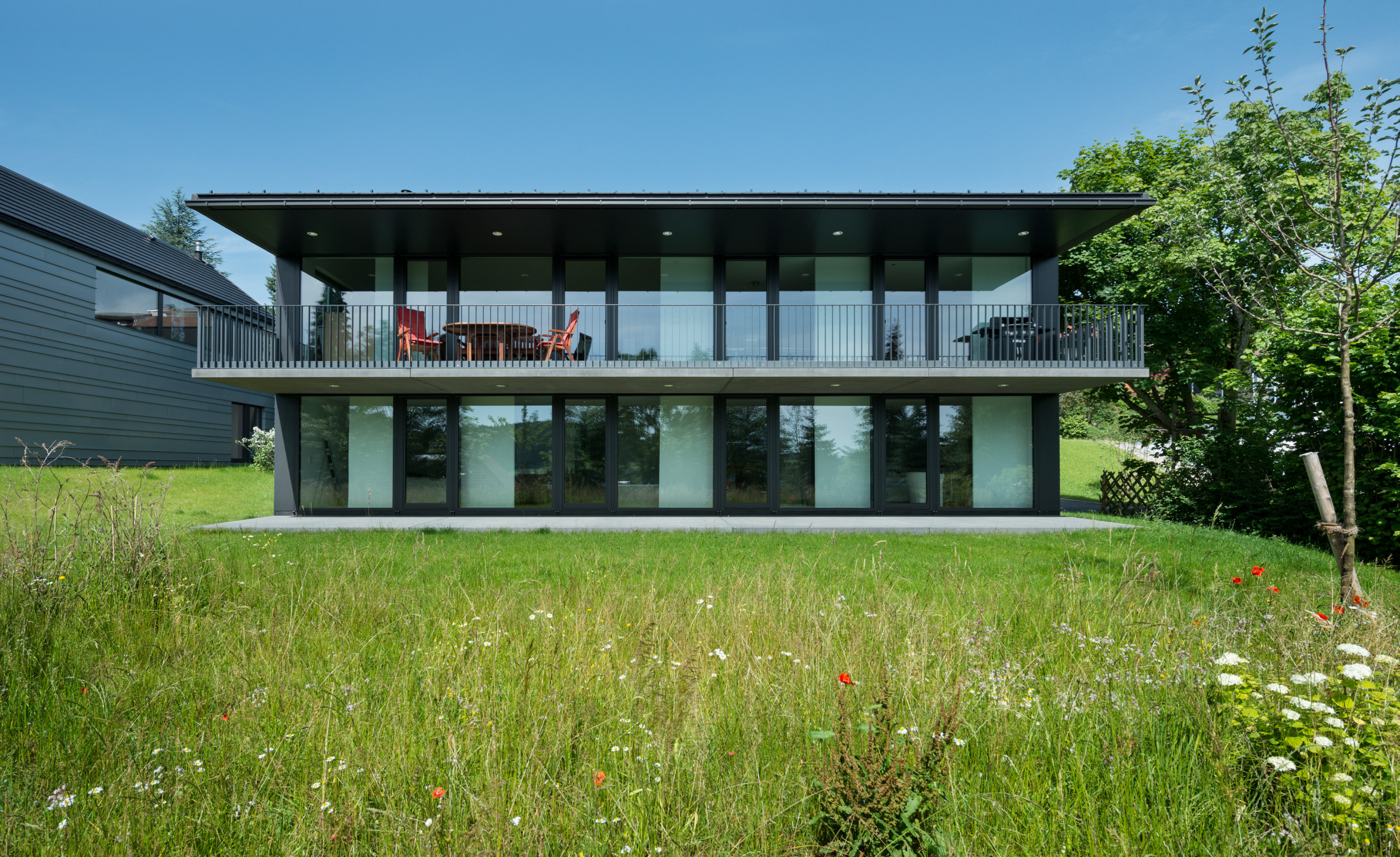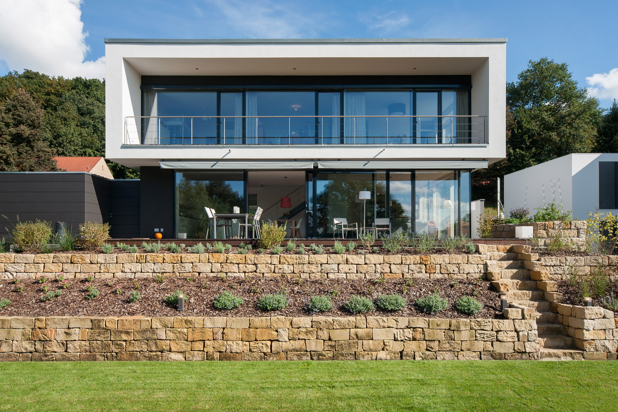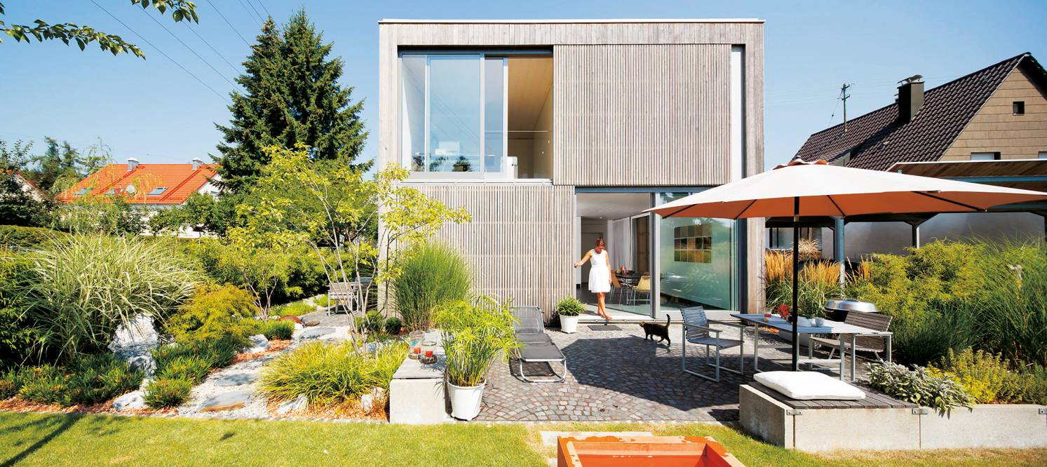 Bei diesem nach Süden ausgerichtetem Einfamilienhaus in Leipzig, Sachsen, konnte auf einen außen liegenden Sonnenschutz verzichtet werden. Die schräg konstruierte Überdachung spendet genug Schatten.