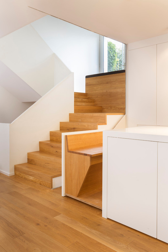 Schon auf dem Zwischenpodest, deutet sich das übergreifende Konzept des Umbaus an: „Wunsch der Bauherren war es, möglichst viel Stauraum schon während der Bauphase zu schaffen“, sagt Messerschmidt. Einbauschränke mit dezenten Grifffugen und eine Sitzbank aus Eiche zum Aufklappen lassen schon im Eingangsbereich allerhand verschwinden.