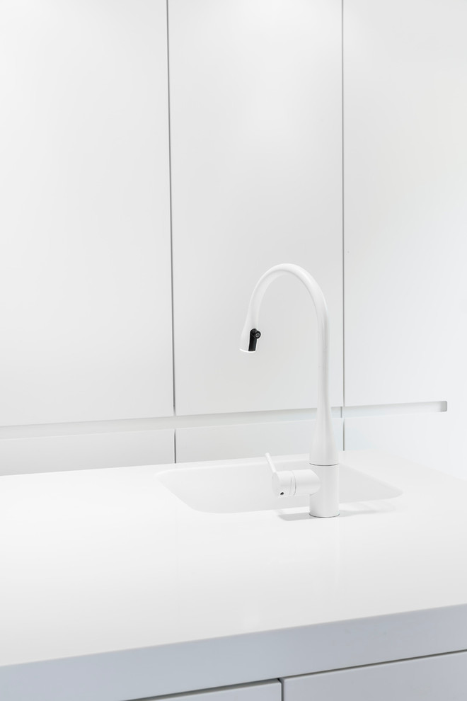 Die weiße Arbeitsfläche besteht aus dem Mineralwerkstoff Corian; das Spülbecken wurde übergangslos aus demselben Material gefertigt.