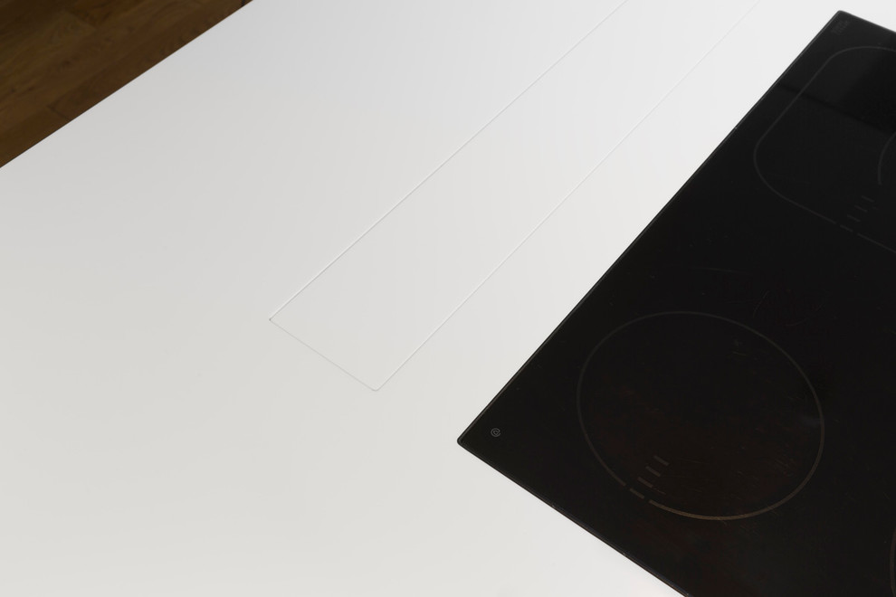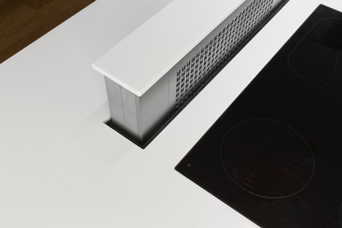 (wären Induktionsherde in weiß erhältlich gewesen, hier wäre garantiert einer!), ist der Dunstabzug im Ruhezustand beinahe unsichtbar in die Arbeitsplatte integriert. Das Modell des Herstellers EMB wurde flächenbündig eingebaut und lässt sich mittels Fernbedienung oder Knopf aus der Arbeitsplatte herausfahren.