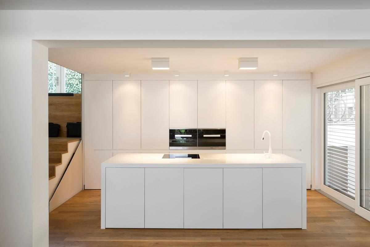 Hinter den Fronten verstecken sich Kaffeemaschine, Toaster und Kochbücher, Gläser, Teller und sonstige Küchenutensilien. Gefertigt hat die Einbauten die Schreinerei MTB aus Edingen, mit der das Team von Mo+ Architekten häufig zusammenarbeitet.