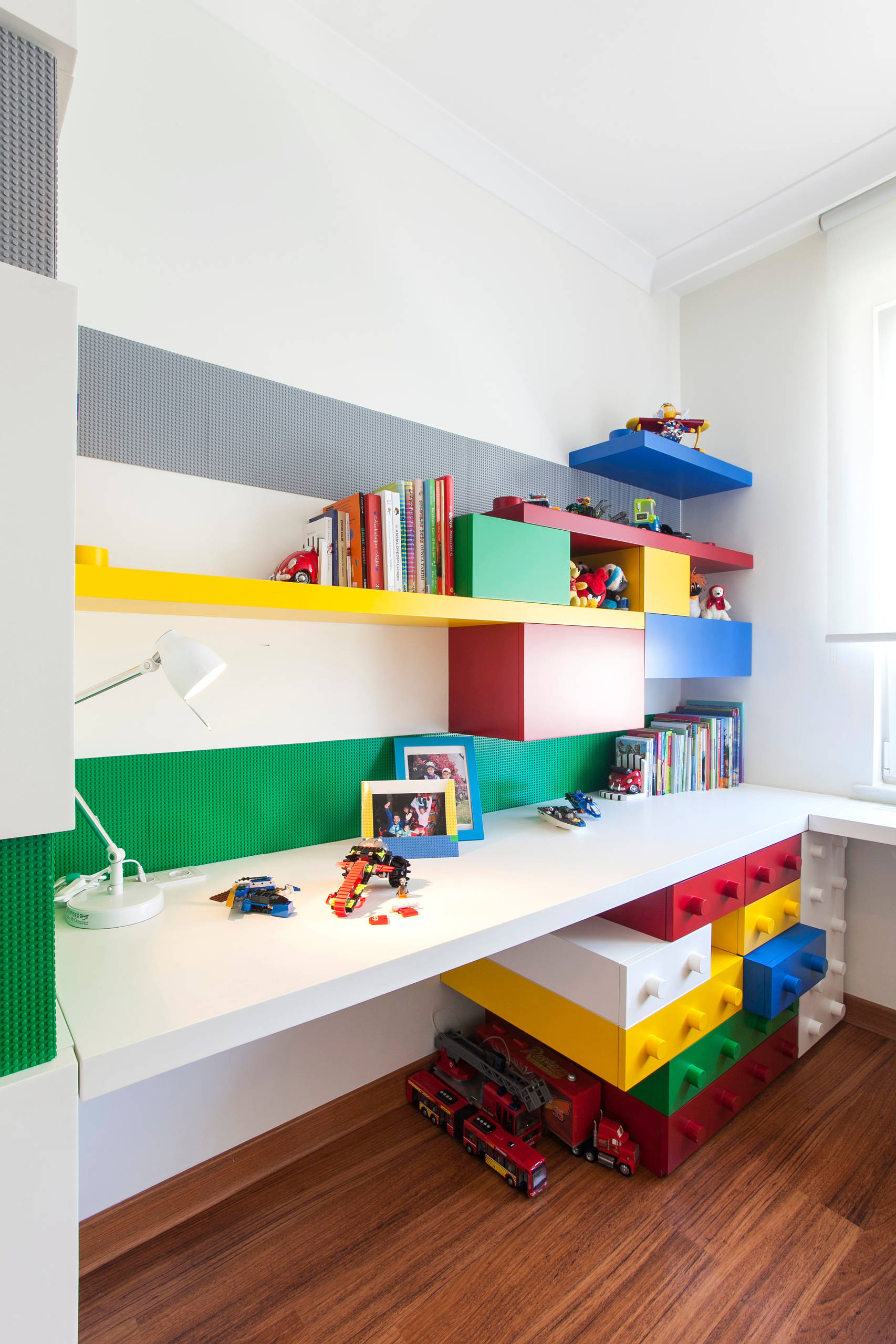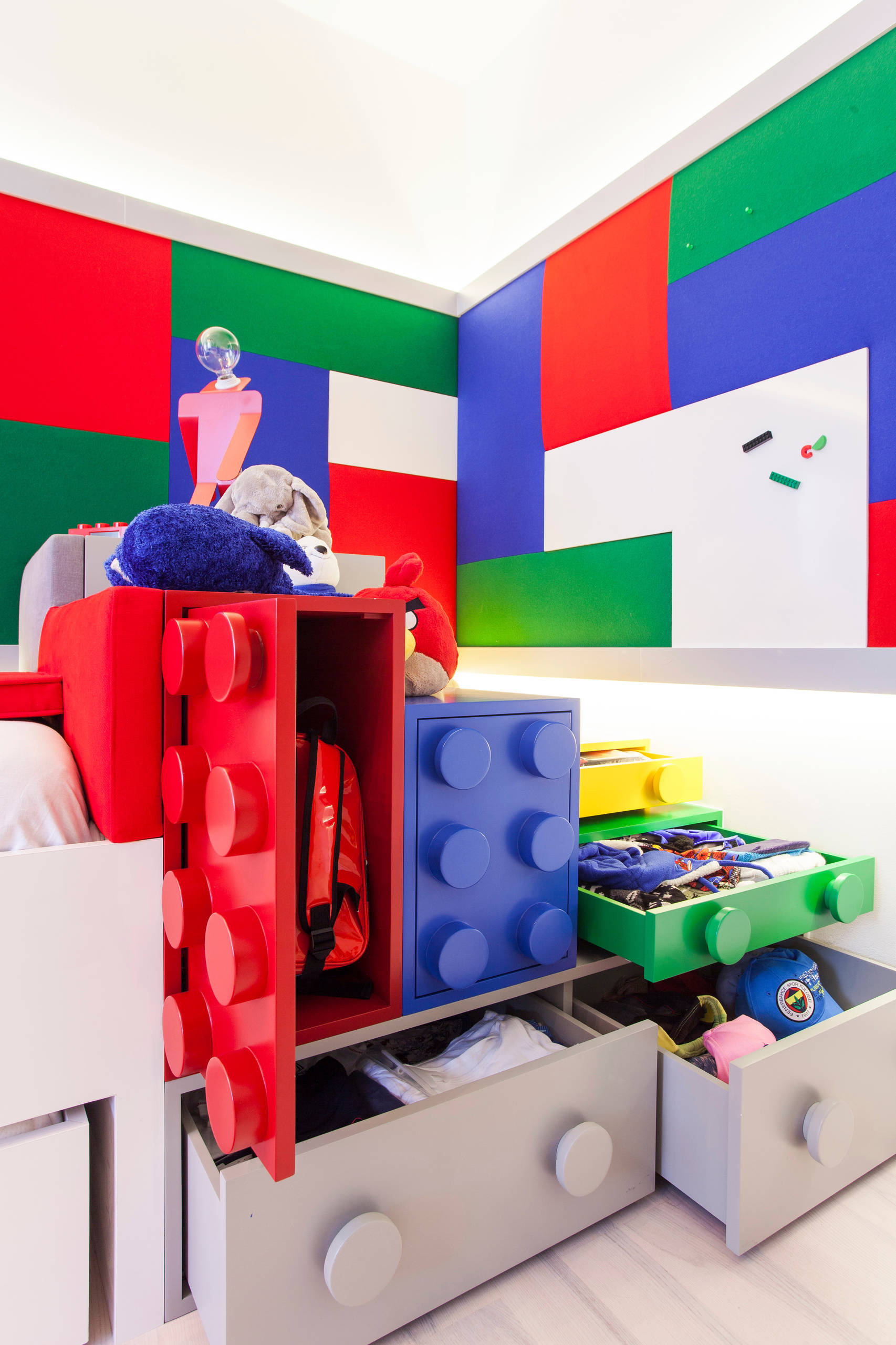 Dass sich die Lego-Idee nicht nur auf den Kleiderschrank beschränkt, sondern konsequent bis in die letzte Ecke des Kinderzimmers wirkt, wird hier schnell deutlich.