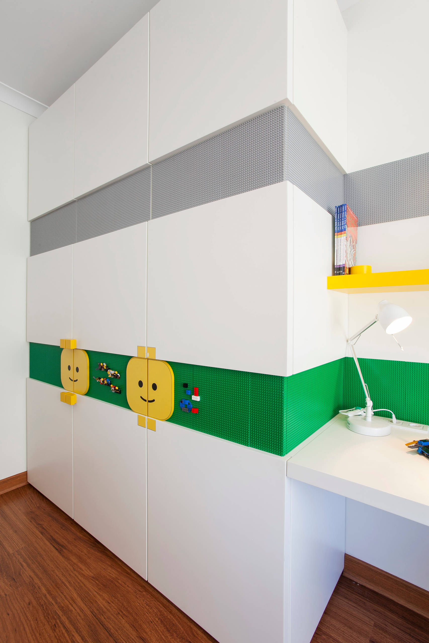 Statt normaler Türgriffe zieren den Kleiderschrank dann auch passenderweise zwei freundliche gelbe Lego-Gesichter, die die Farbe des benachbarten Wandregals aufnehmen. Alles in allem eine sehr frische und fröhliche Farbkombination.