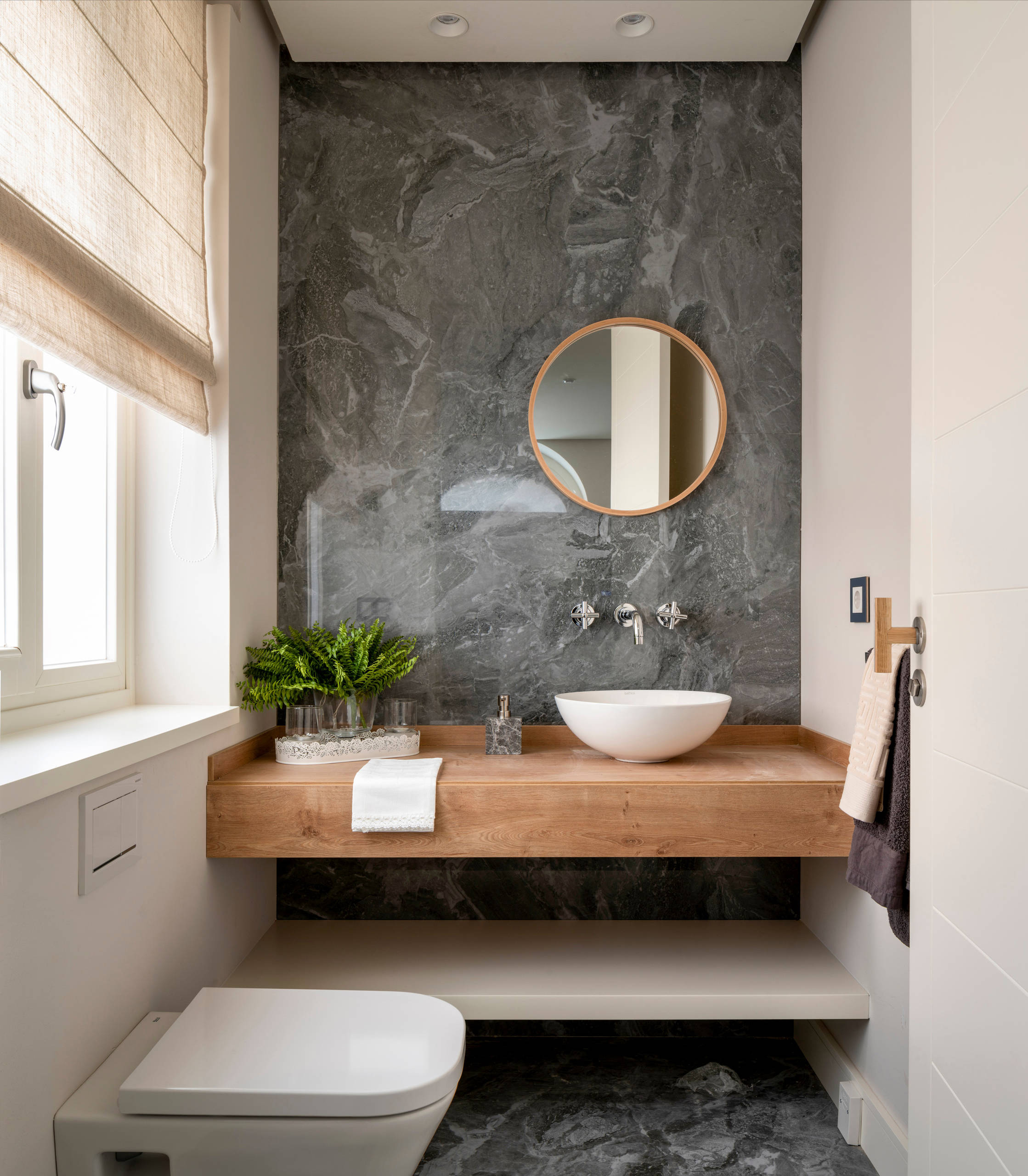In diesem Gäste-WC von Sube Susaeta Interiorismo wurden die klaren Linen und geraden Kanten von Raum und Waschtisch mit rundem Waschbecken und Spiegel harmonisch – ja, wie es so schön heißt – abgerundet.