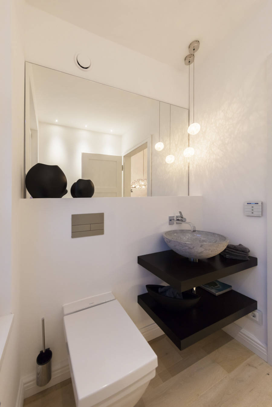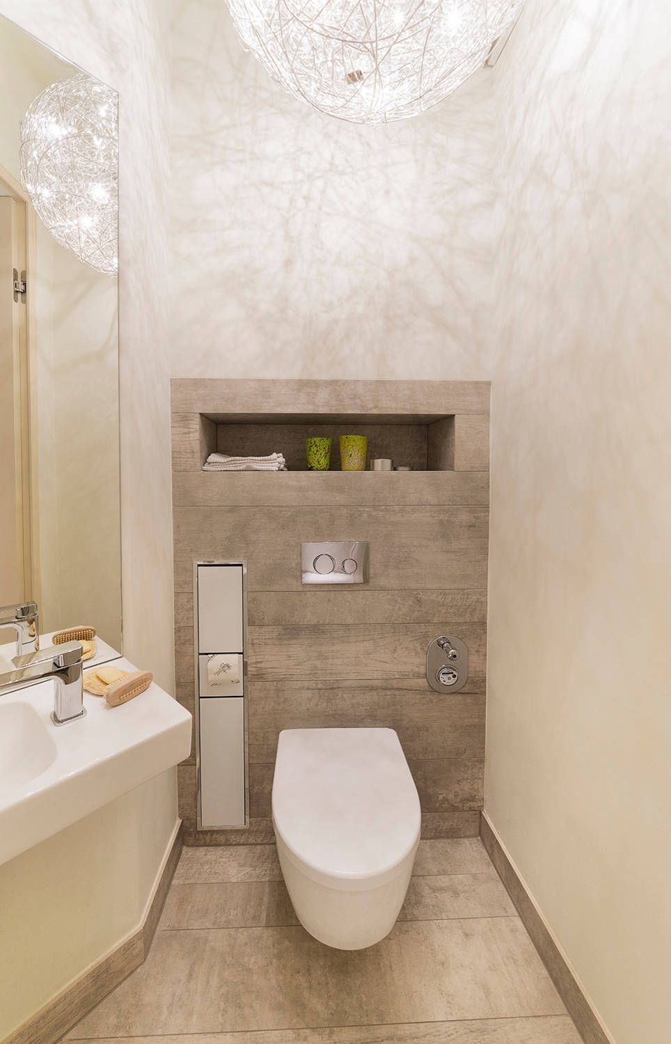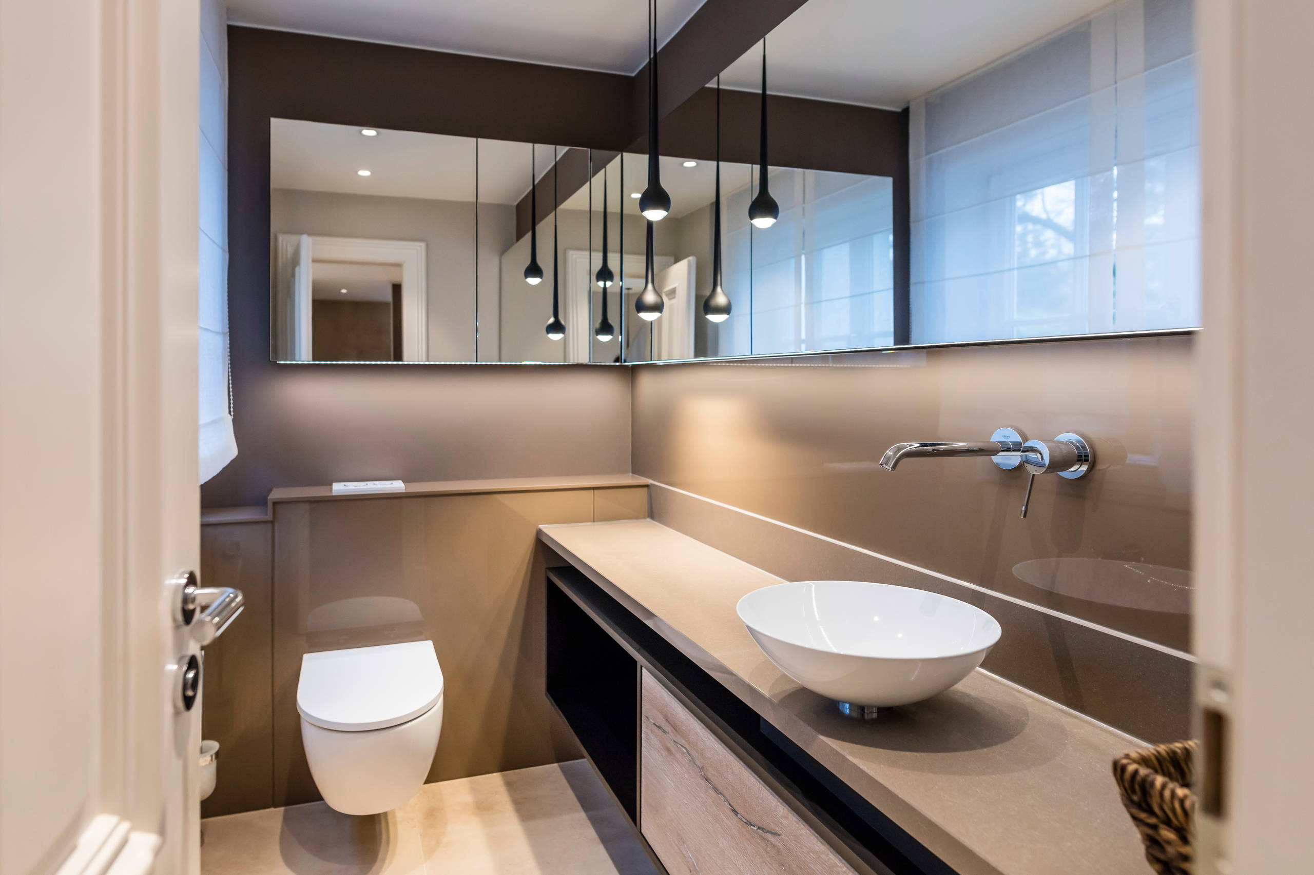 Leuchten, wie Tropfen von der Decke, lassen in diesem Gästeklo zusammen mit den maßgefertigten Badmöbeln von RESCH Innenausbau eine warme Atmosphäre entstehen.