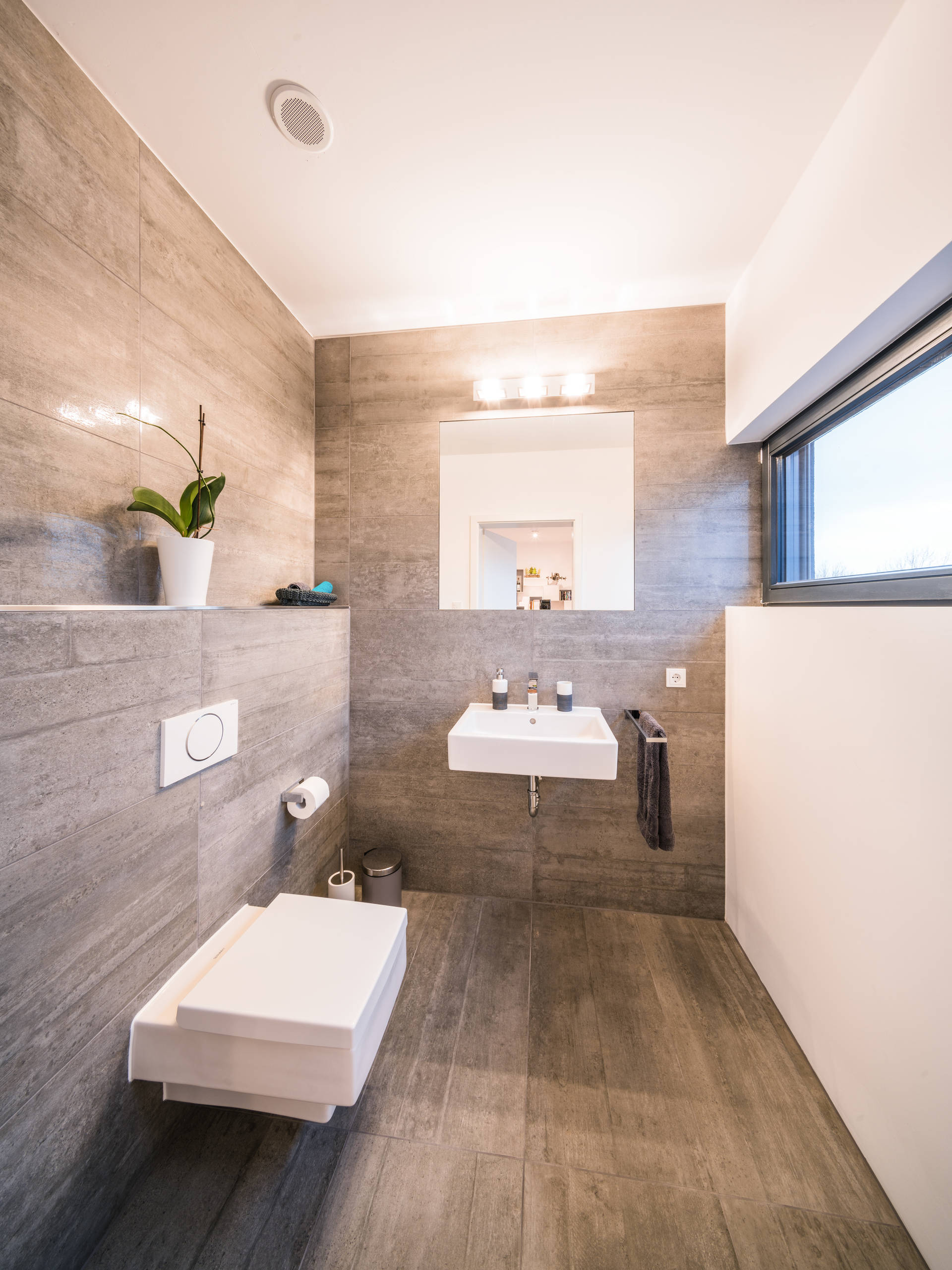 lucente Lichtplanung sorgten in diesem Gäste-WC für eine warme und ausgeglichene Stimmung. Der große Spiegel unterstützt das Lichtkonzept und lässt den Raum gleichzeitig größer wirken.