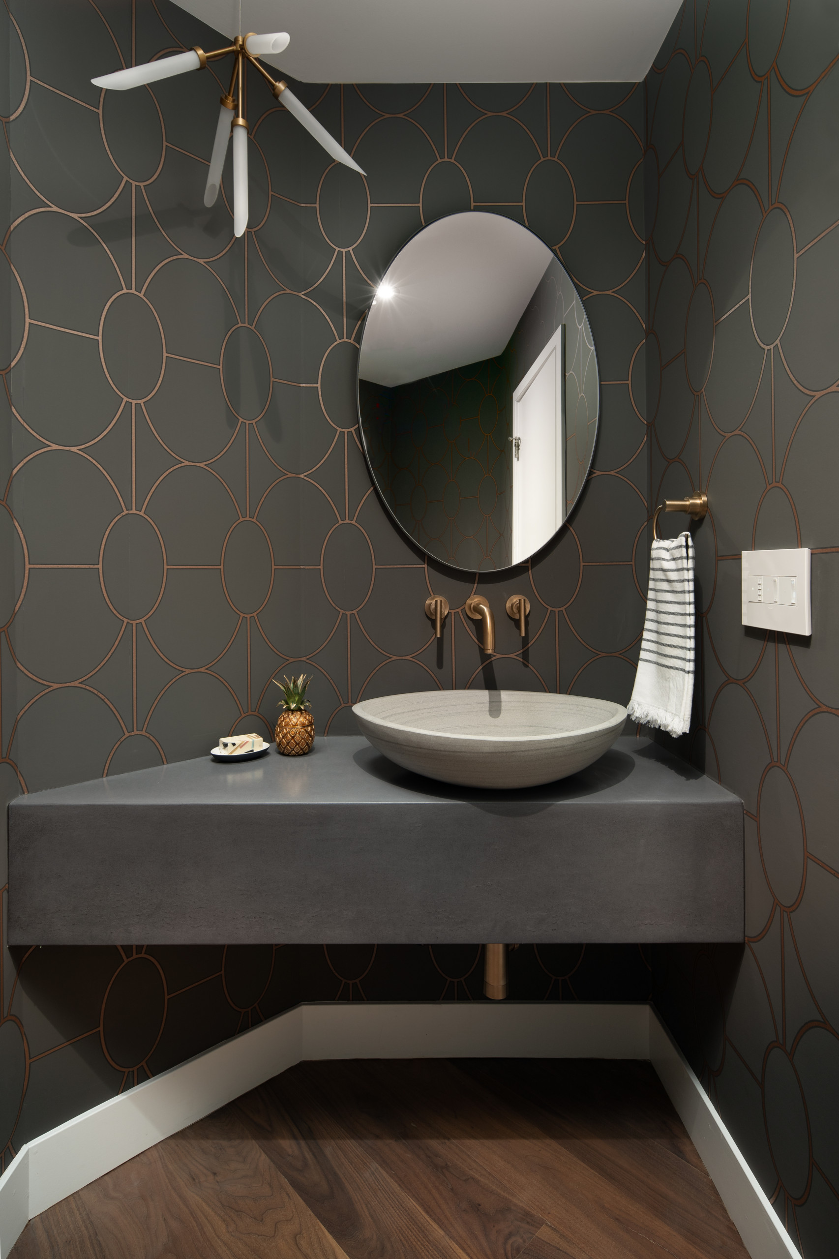 Der Waschtisch fügt sich perfekt in die Ecke. Die Messing-Armaturen treten vor dem dunklen Grauton besonders gut hervor. Festgehalten von Dane Cronin Photography