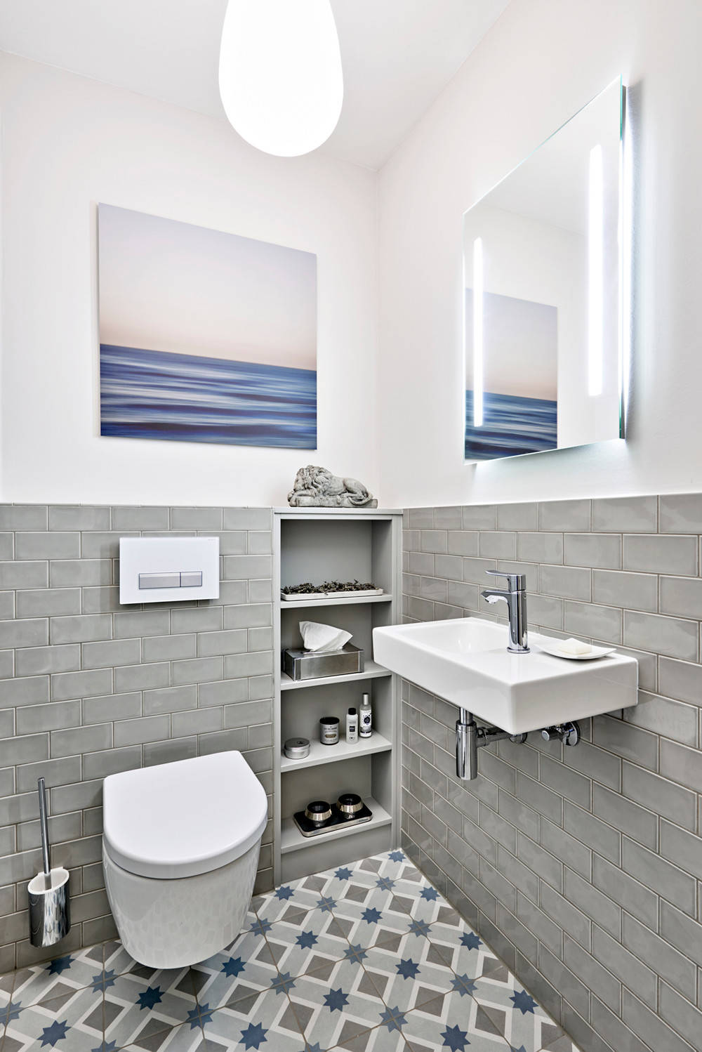 Hier konnte besonders das in die Wand eingelassene Regal überzeugen, aber auch die Wand- und Bodenfliesen gefielen den Houzz-Usern. Gestaltet von Home Styling Hamburg