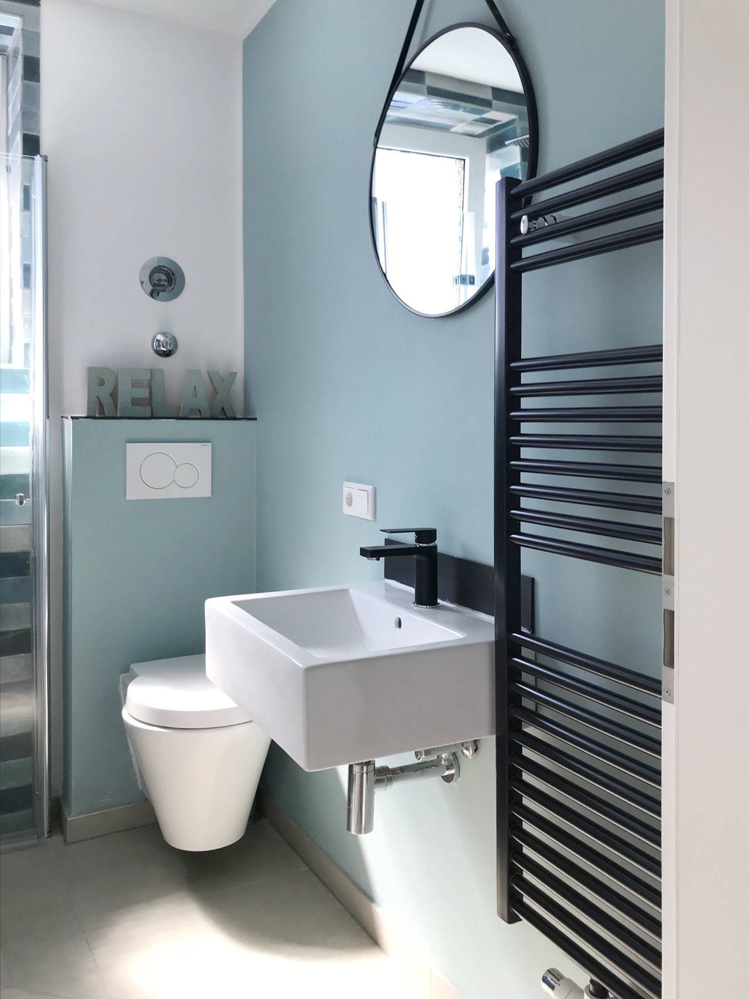 Bei diesem Projekt von bmh Architekten haben besonders die Wandfarbe und der Heizkörper die Aufmerksamkeit der Houzz-User auf sich gezogen. Kühle Farben treten optisch zurück und eignen sich gut für den kleinen Raum.