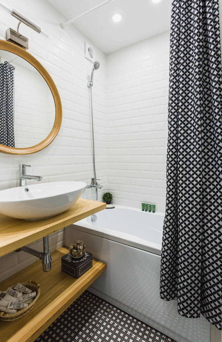 9. Ein neuer Duschvorhang. Ihr Bad bekommt mit einem neuen Duschvorhang einen Frische-Kick! Ob wie hier klassisch in Schwarzweiß oder in muntermachenden Blau-, Grün- und Aquatönen – Ihr Bad gewinnt an Wertigkeit und Wohlfühlatmosphäre. Je hochwertiger der Stoff, desto wohnlicher die Optik.