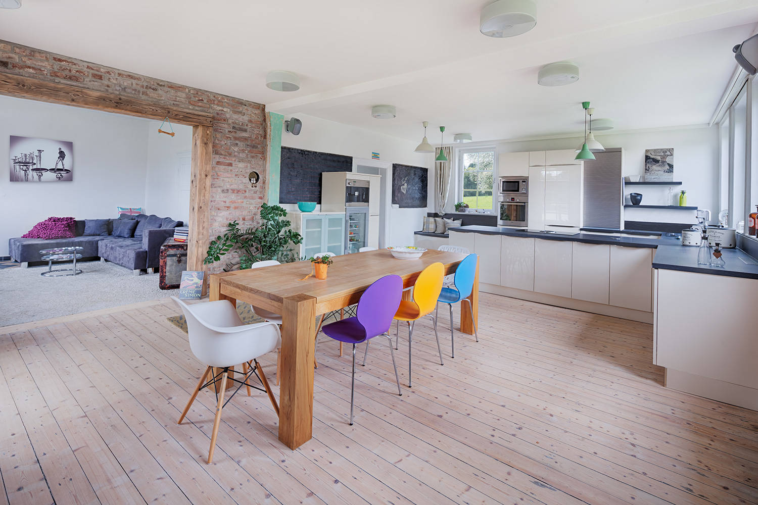 6. Farbenfrohe Stühle. Ihren Essplatz können Sie schnell mit ein paar neuen Stühlen „aufmischen“. Simpel und schön: Designklassiker in leuchtenden Farben. Wenn sich der Farbton noch einmal im Raum wiederholt, wirkt’s besonders gekonnt und harmonisch. Alten Holzstühlen können Sie mit einem Anstrich ebenfalls einen neuen, modernen Look verpassen. Streichen Sie entweder den ganzen Stuhl oder bepinseln zum Beispiel auch nur die Stuhlbeine.