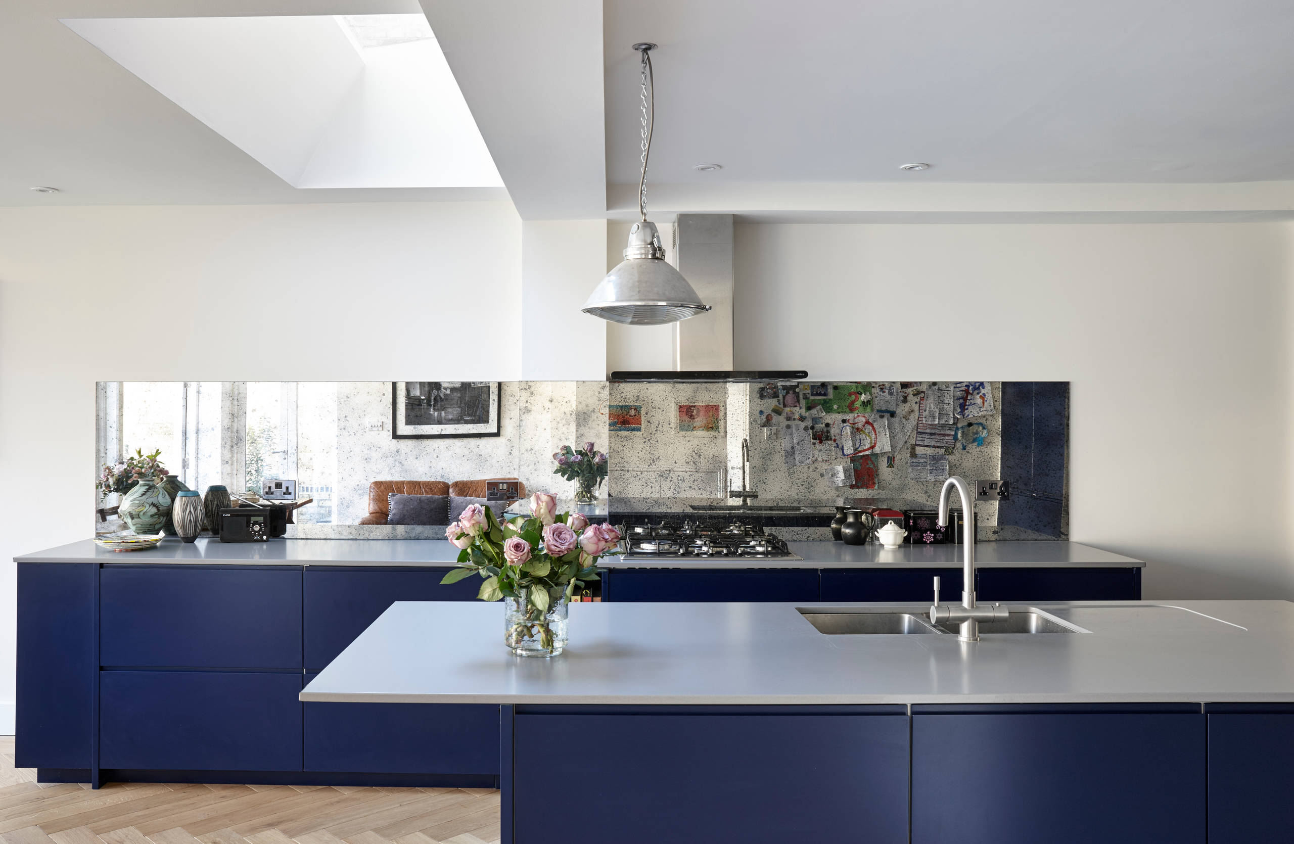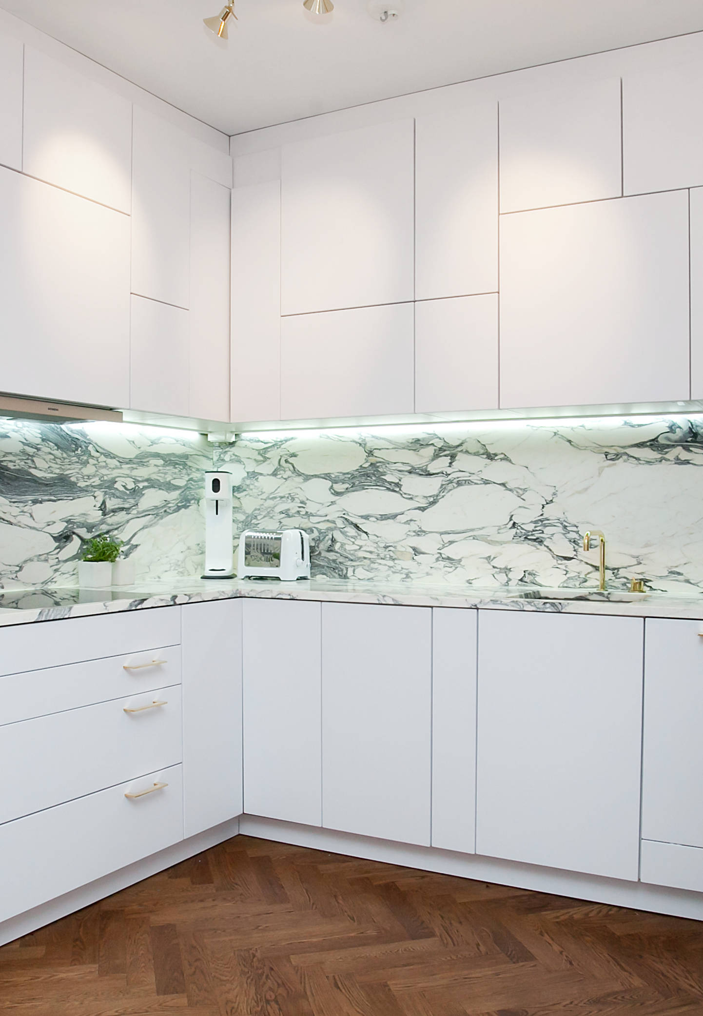 Ein edles Material anstelle des schnöden Fliesenspiegels kann auch in Ihrer Küche für Noblesse sorgen. Dafür müssen Sie nicht einmal den vorhandenen Spritzschutz entfernen – schon mit Klebefolie oder Farbe gelingt Ihnen das Upgrade. Besonders schick ist zum Beispiel ein Spritzschutz in Marmor-Optik. Richtig glamourös wird es mit Spiegelflächen, in denen sich Ihre Glam-Einrichtung gleich verdoppelt.