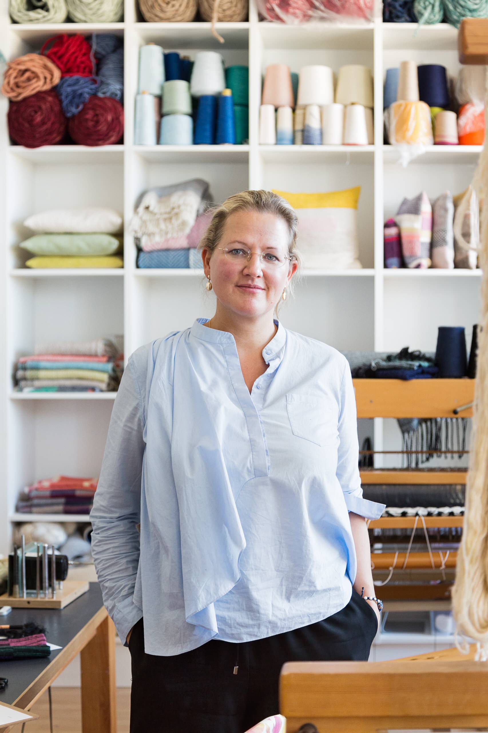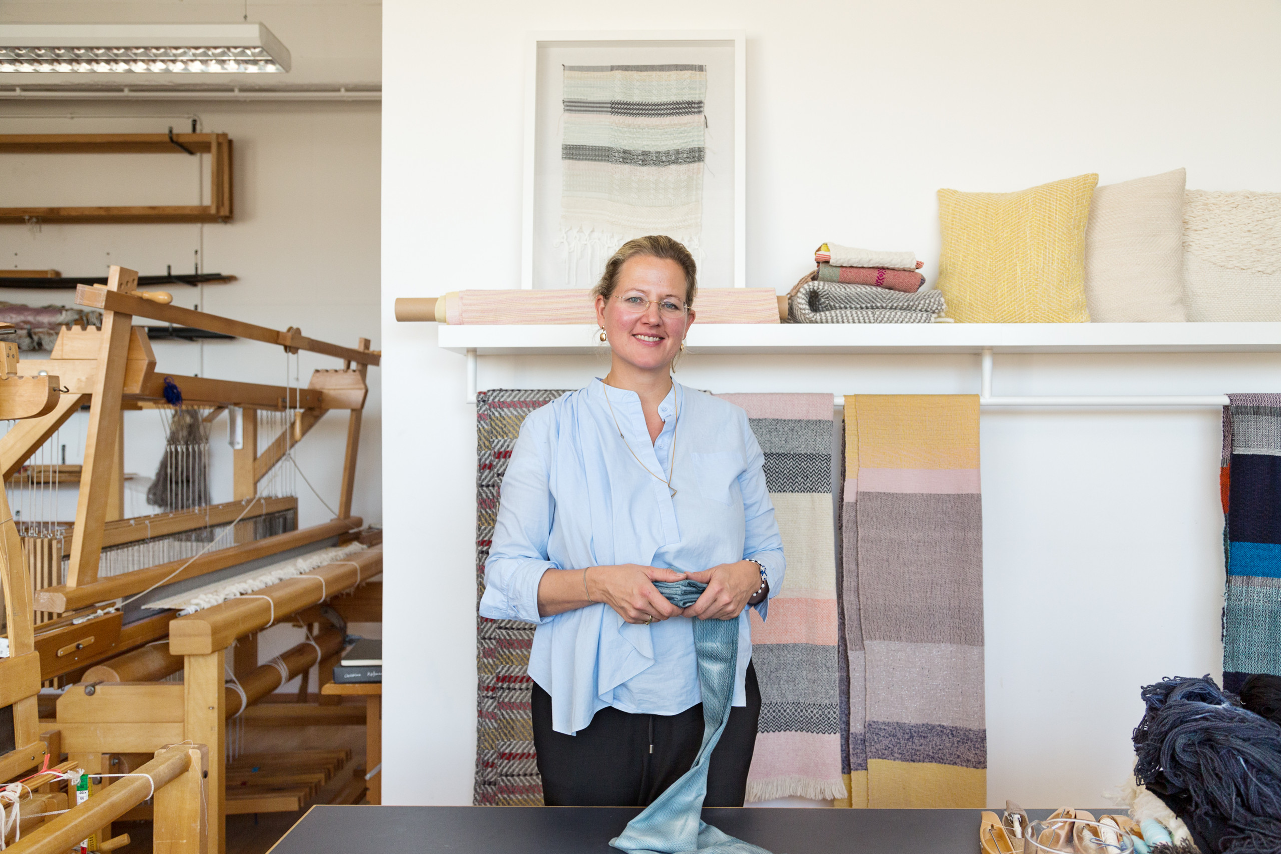 Dort, wo die Textildesignerin Christina Kleßmann arbeitet, treffen Handwerk, Kunst und Design aufs Schönste aufeinander. In ihrem Berliner Atelier, gelegen in einem alten Fabrikgebäude, webt und kreiert sie Heimtextilien, Accessoires und Stoffe für Kleidung, oftmals inspiriert von der Klarheit und Helligkeit des skandinavischen Designs. Alle Werke, die das Atelier verlassen – Gebrauchstextilien wie Teppiche, Wolldecken, Schals oder Taschen, aber auch textile Objekte und Wandbehänge – sind von Hand gefertigte Unikate. Aber nicht nur das macht sie so besonders.