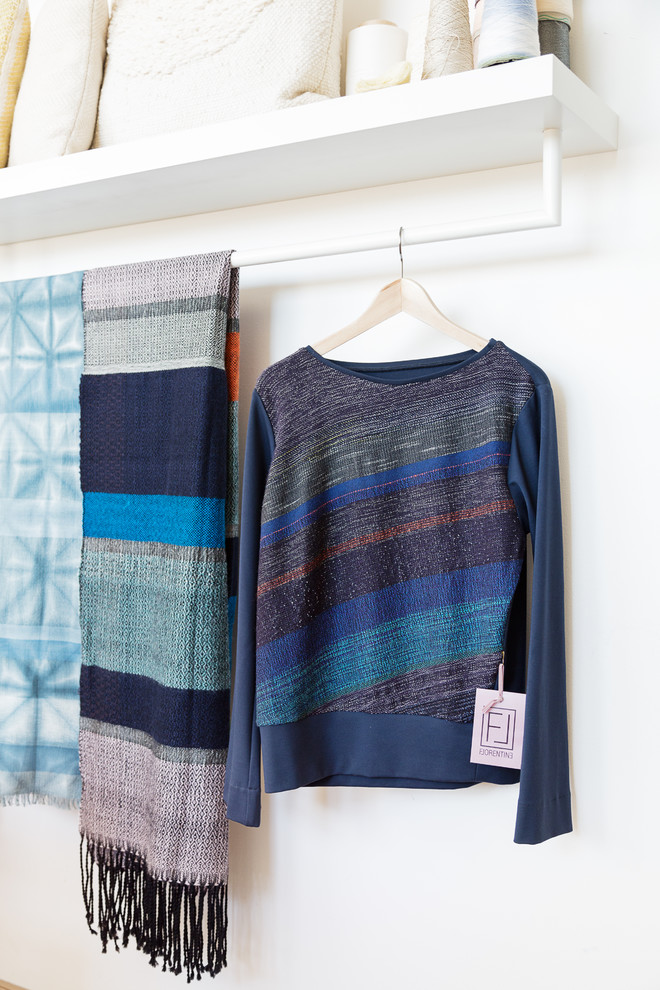 Häufig arbeitet Kleßmann mit Firmen aus dem Interior- oder Fashion-Bereich zusammen, wie etwa mit der befreundeten Modedesignerin Florentine Krieß, welche die handgewebten Stoffe beispielsweise zu Pullovern (im Bild) weiterverarbeitet. Die meisten Aufträge kommen jedoch von Privatpersonen.