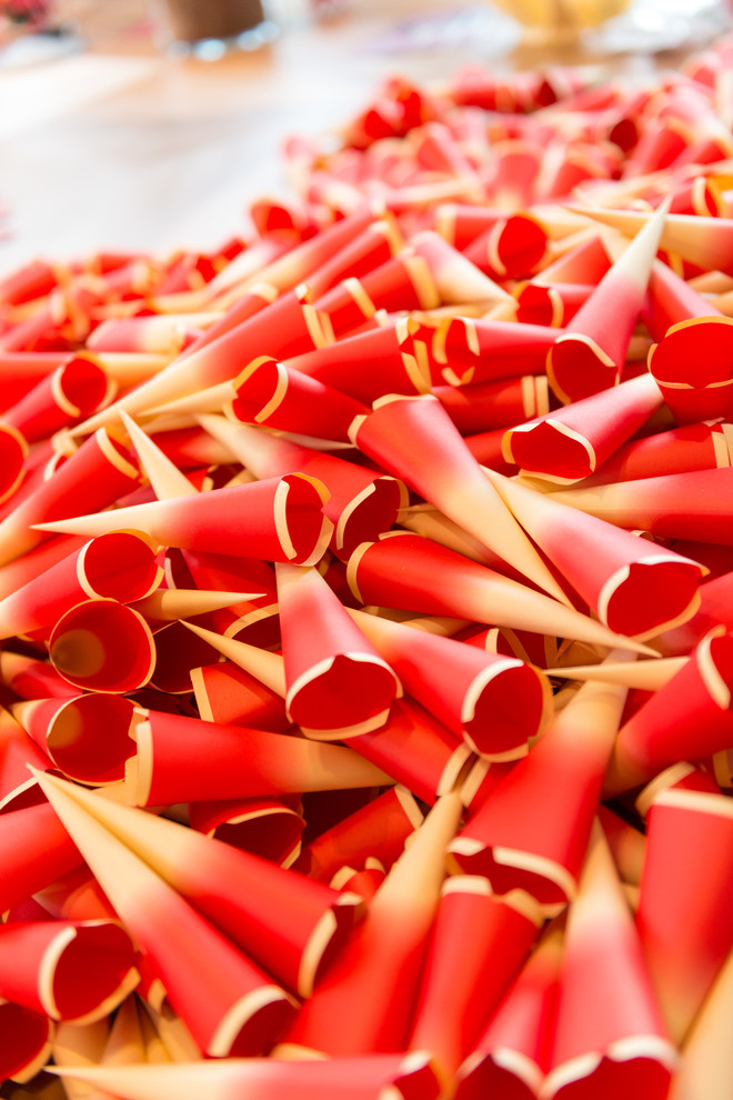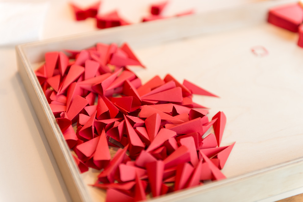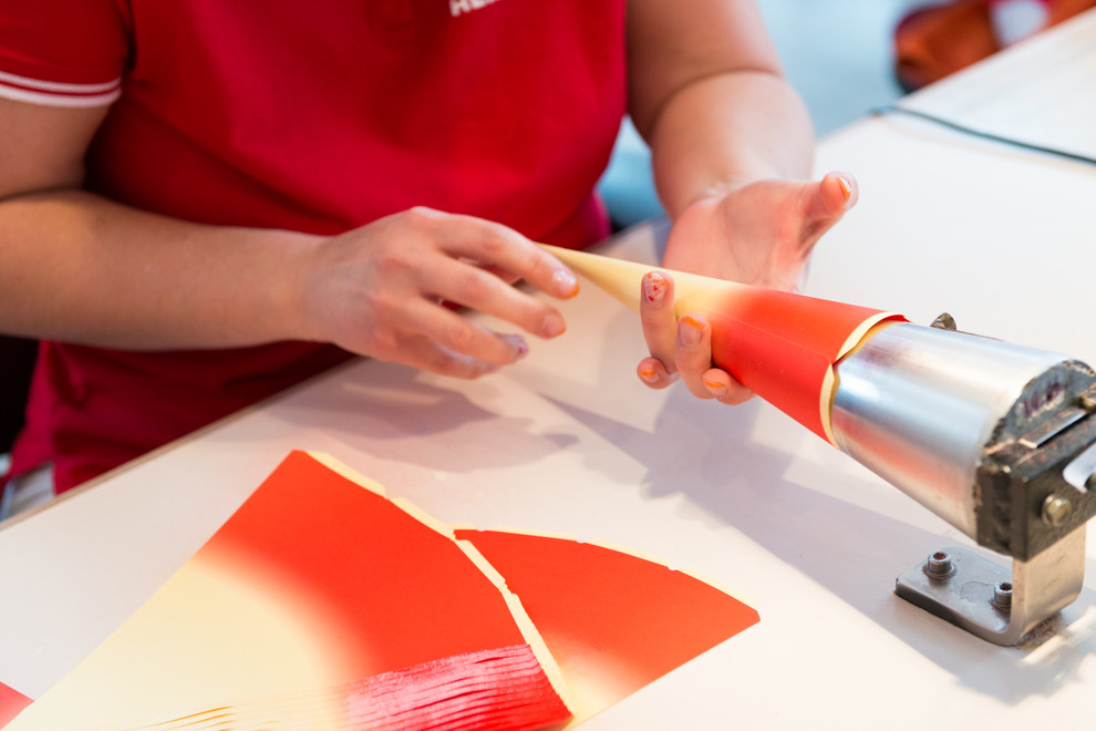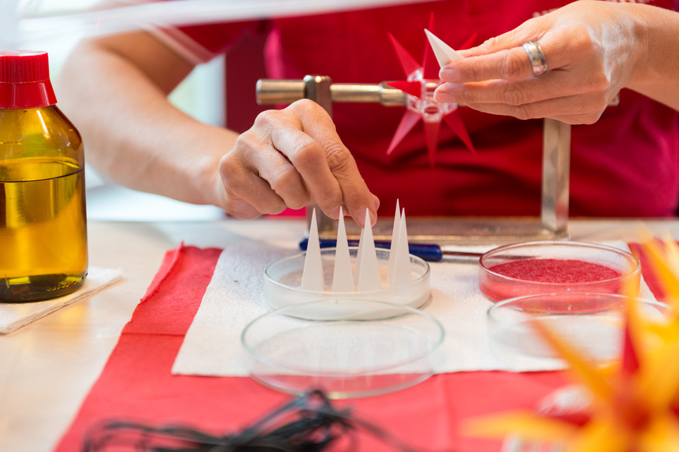 In der Spitzeldreherei der Papier-Variante wird ein- oder mehrfarbiges Papier per Hand zu einem Kegel gedreht. Zuvor wird es an den Rändern mit Leim bestrichen. Anschließend werden die Kegel zum Trocknen ausgelegt. „Eine Spitzeldreherin dreht etwa 2500 Zacken am Tag“, erzählt Jacqueline Schröpel. „Der ursprüngliche Stern wurde in Weiß und Rot hergestellt: Weiß für die Reinheit und Rot für das Blut Christi“, so Schröpel.