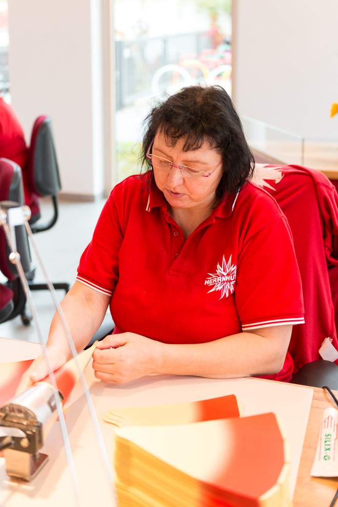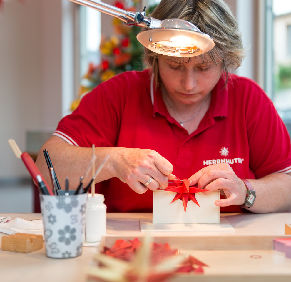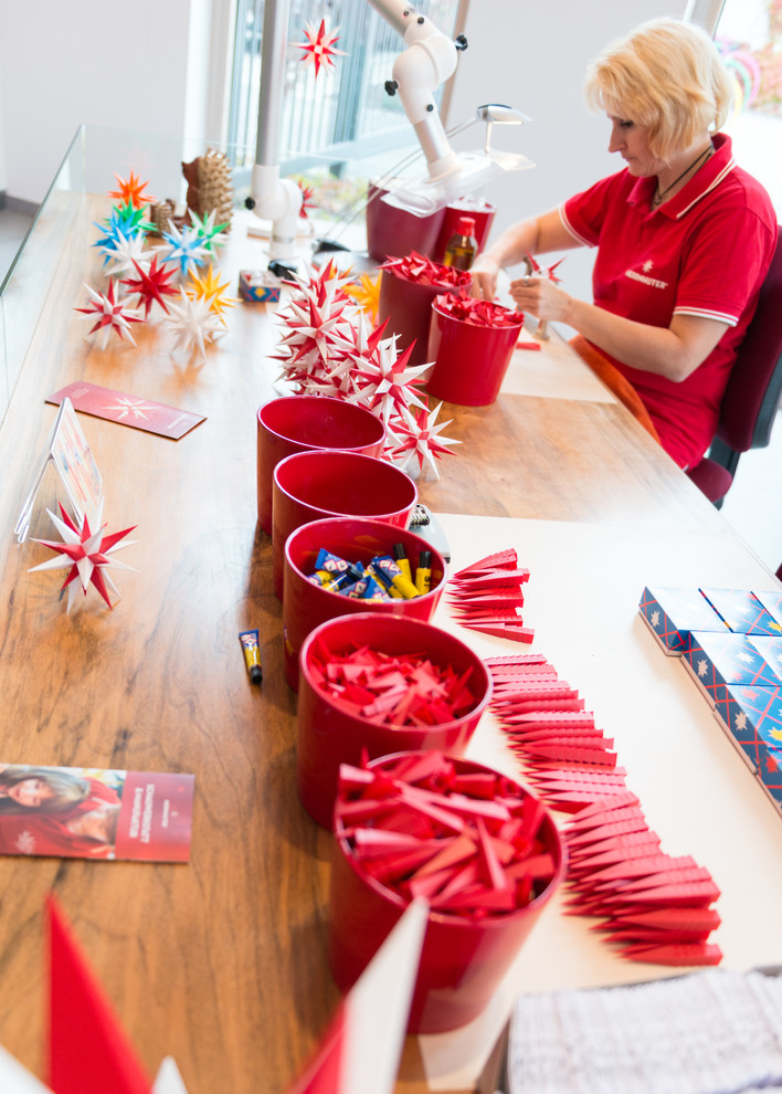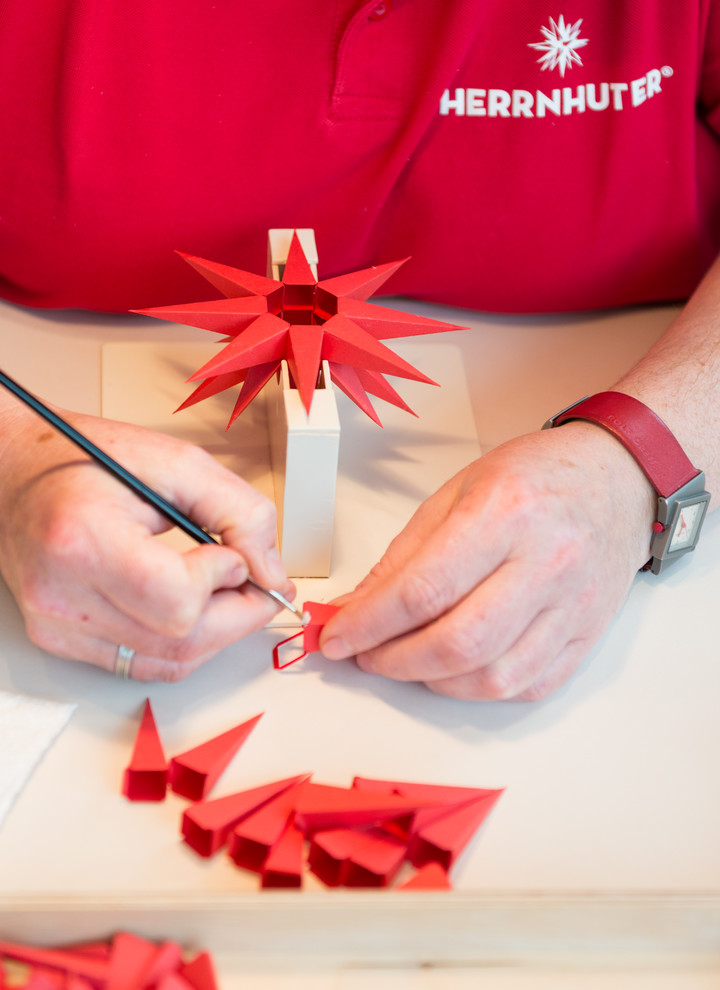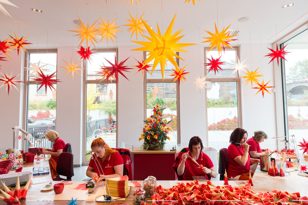 Betritt man die Werkstätten der Herrnhuter-Sterne-Manufaktur, ist der Raum von frischem Papierduft erfüllt. Man hört leise das Falten, Drehen und Kleben von Papier, sieht die Bögen von einer Hand in die andere gleiten. So wird hier Zacke für Zacke des Sterns in Form gebracht. Vor fünf Jahren zog die Manufaktur in ein neues Gebäude, am gleichen Standort nur wenige Schritte vom alten Fachwerkhaus entfernt. „Die vielen Jahrzehnte Manufakturbetrieb gingen nicht spurlos an den Gebäuden vorbei. Im neuen Haus haben wir nicht nur mehr Platz für unsere Mitarbeiterinnen, sondern auch für die vielen Besucher, die jedes Jahr kommen, um unser Handwerk zu bestaunen und einen Herrnhuter Stern mit nach Hause zu nehmen“, so Schröpel.