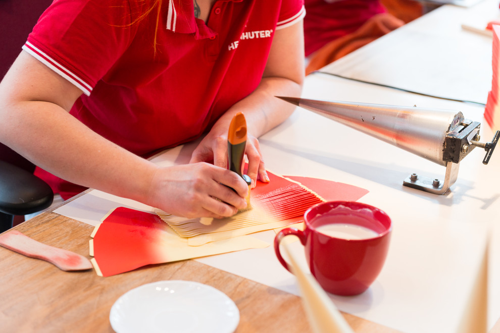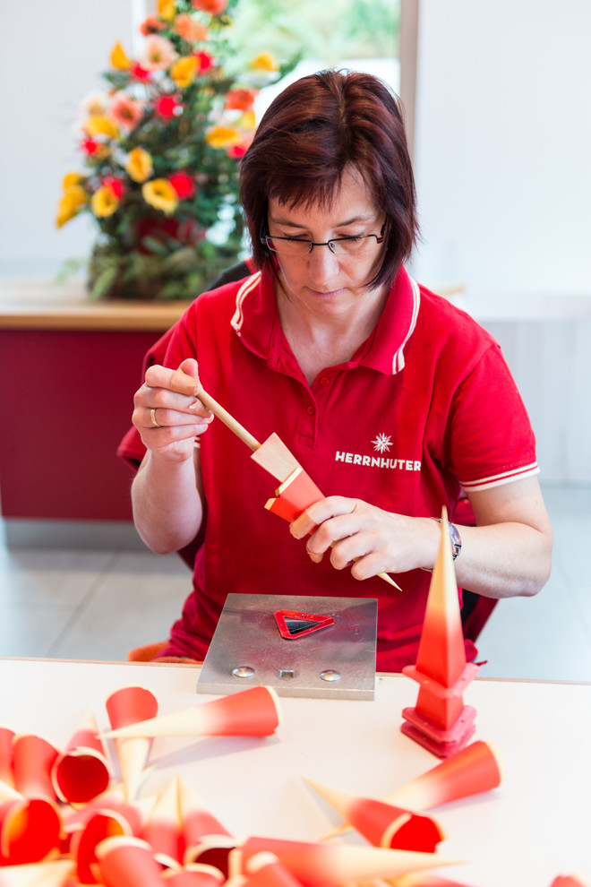 Der kleinste aller Papiersterne wird gestanzt, dann mit dem Messer gefalzt und mit Pinsel und Pinzette angeklebt. „Er ist mit 13 Zentimetern Durchmesser ein richtiges kleines Meisterwerk“, so Schröpel. Es dauert eineinhalb Stunden, bis ein solcher Stern fertig ist. „Unsere Mitarbeiterinnen fertigen ihn mit viel Fingerspitzengefühl an. Jedes Jahr gibt es nur eine limitierte Auflage – denn pro Tag entstehen maximal 13 solcher Sterne. Und man kann ihn auch nur hier in Herrnhut kaufen. Damit möchten wir die Besonderheit des kleinen Sterns hervorheben.“