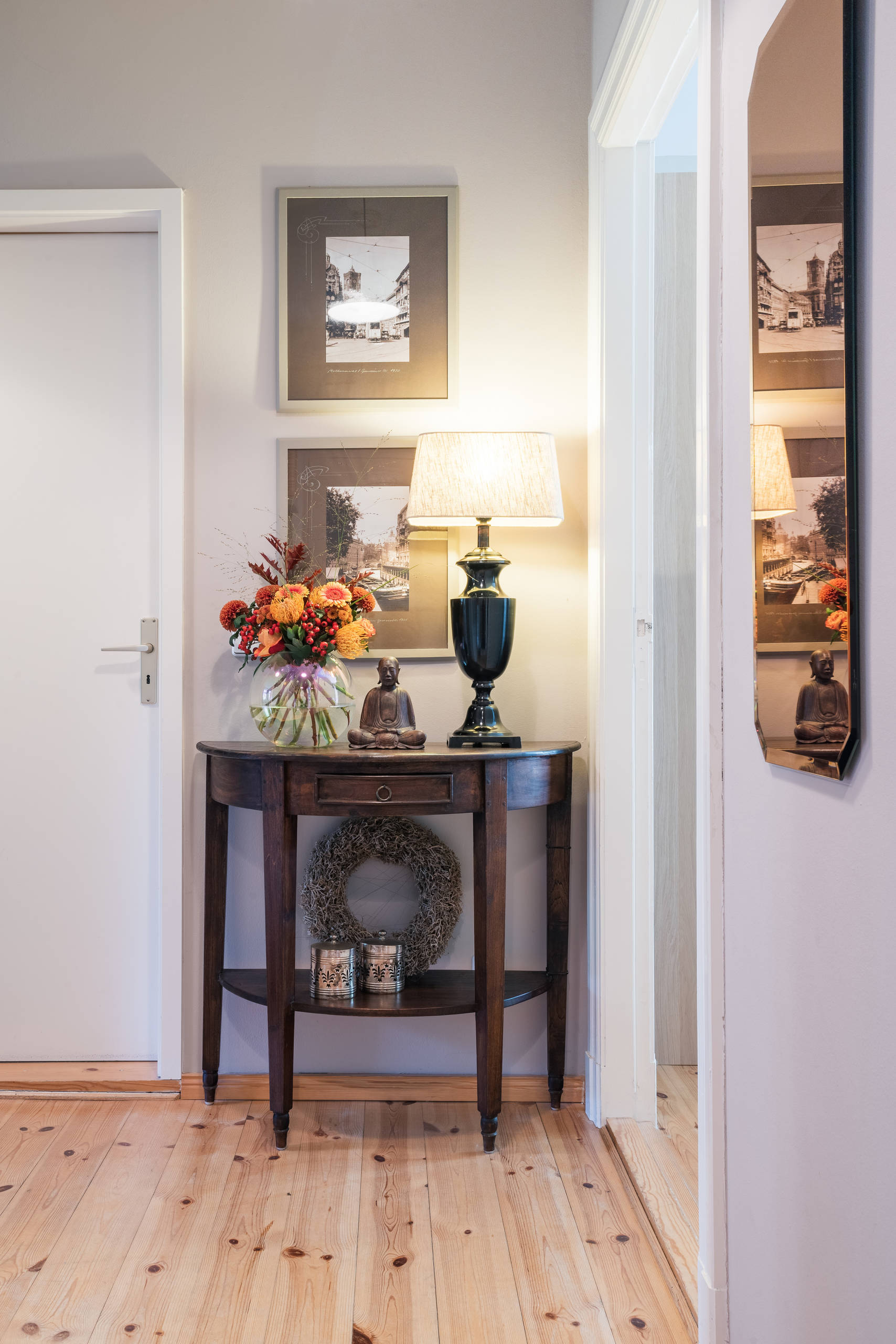 Der innenliegende Flur profitiert von zusätzlichen Lichtquellen. Die harmonisch arrangierten Accessoires frischen die sonst dunkle Ecke zwischen den Türen auf. Der halbrunde Beistelltisch stammt aus dem Möbelpark Sachsenwald und ist ein etwa 30 Jahre altes Fundstück.