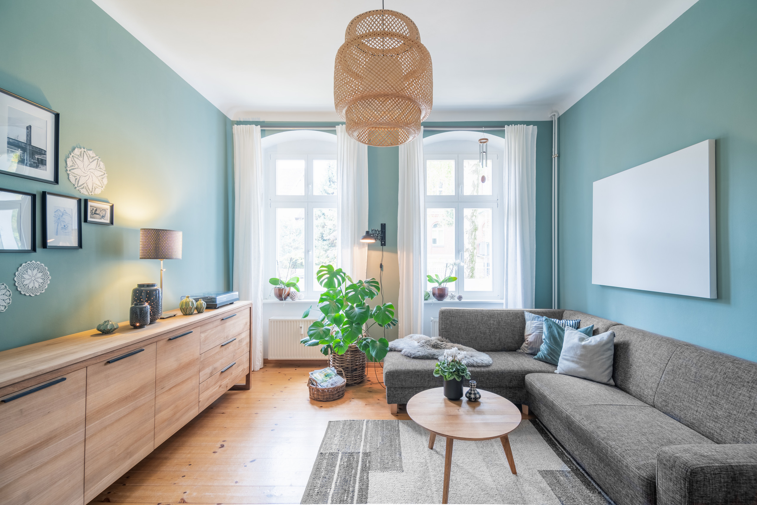 Eine gute Umstellung. Im Wohnzimmer sorgt eine ökologische Wandfarbe in einem beruhigenden Türkiston für eine neue Wohlfühl-Atmosphäre. Gleichzeitig entspricht die Wahl dem Wunsch nach maritimen Farben, der sich auch in den verschiedenen Accessoires wiederfindet.