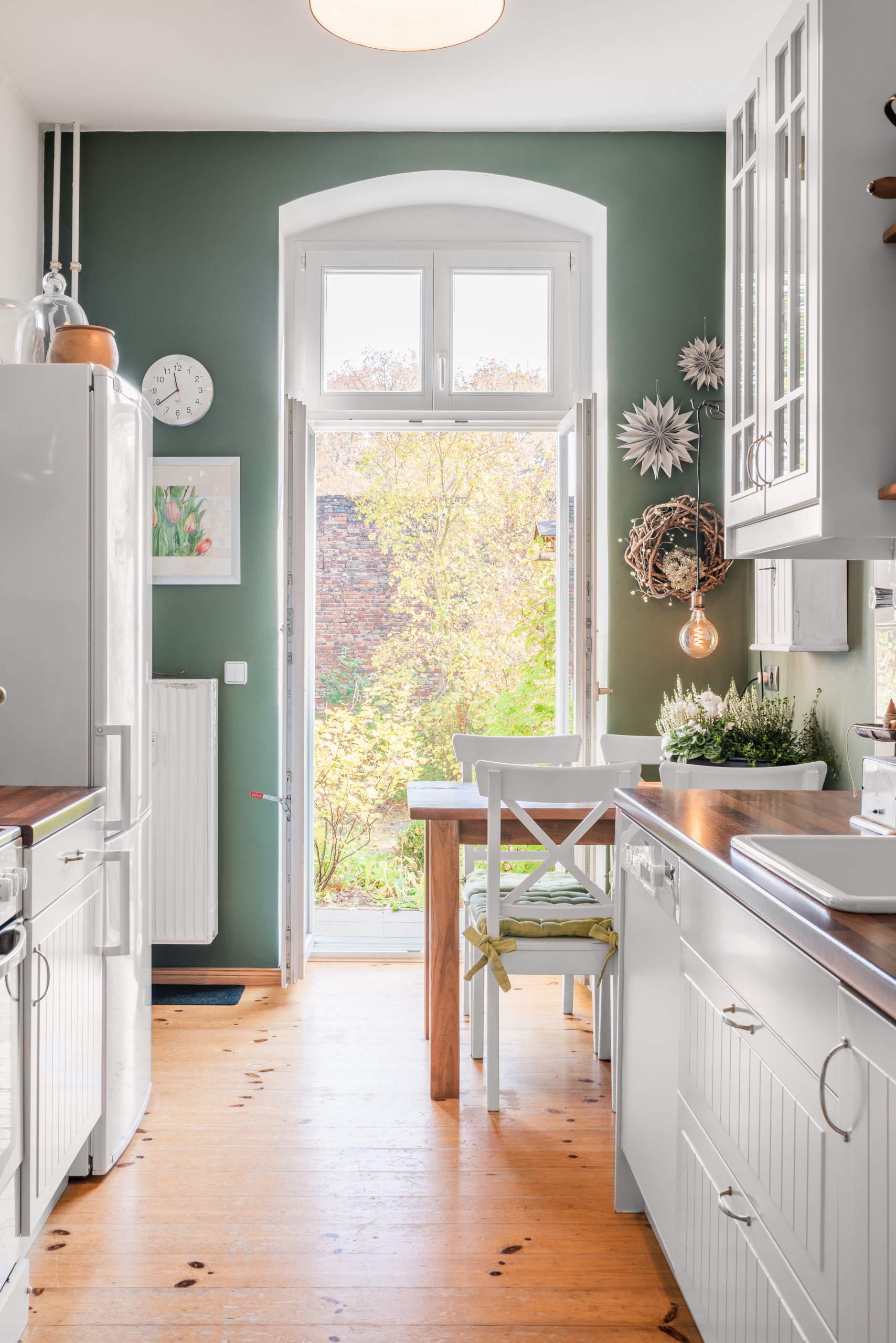 In der Küche befindet sich der Essbereich aufgrund des schmal geschnittenen Raums dennoch direkt bei der Tür, die zur Terrasse führt, auch wenn dies nach Feng-Shui nicht ideal ist.