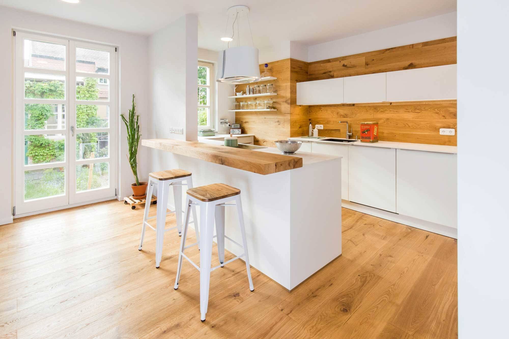 Der Arbeitsraum Küche war entschieden zu klein, entschied das Bauehepaar. Die Wohnkomplizen expandierten daher ins angrenzende Arbeitszimmer und verbanden die beiden kleinen Kämmerchen zu einer hellen Wohnküche. Ein separates Arbeitszimmer gibt es im Erdgeschoss des Altbaus nun nicht mehr, aber das wird auch nicht benötigt.