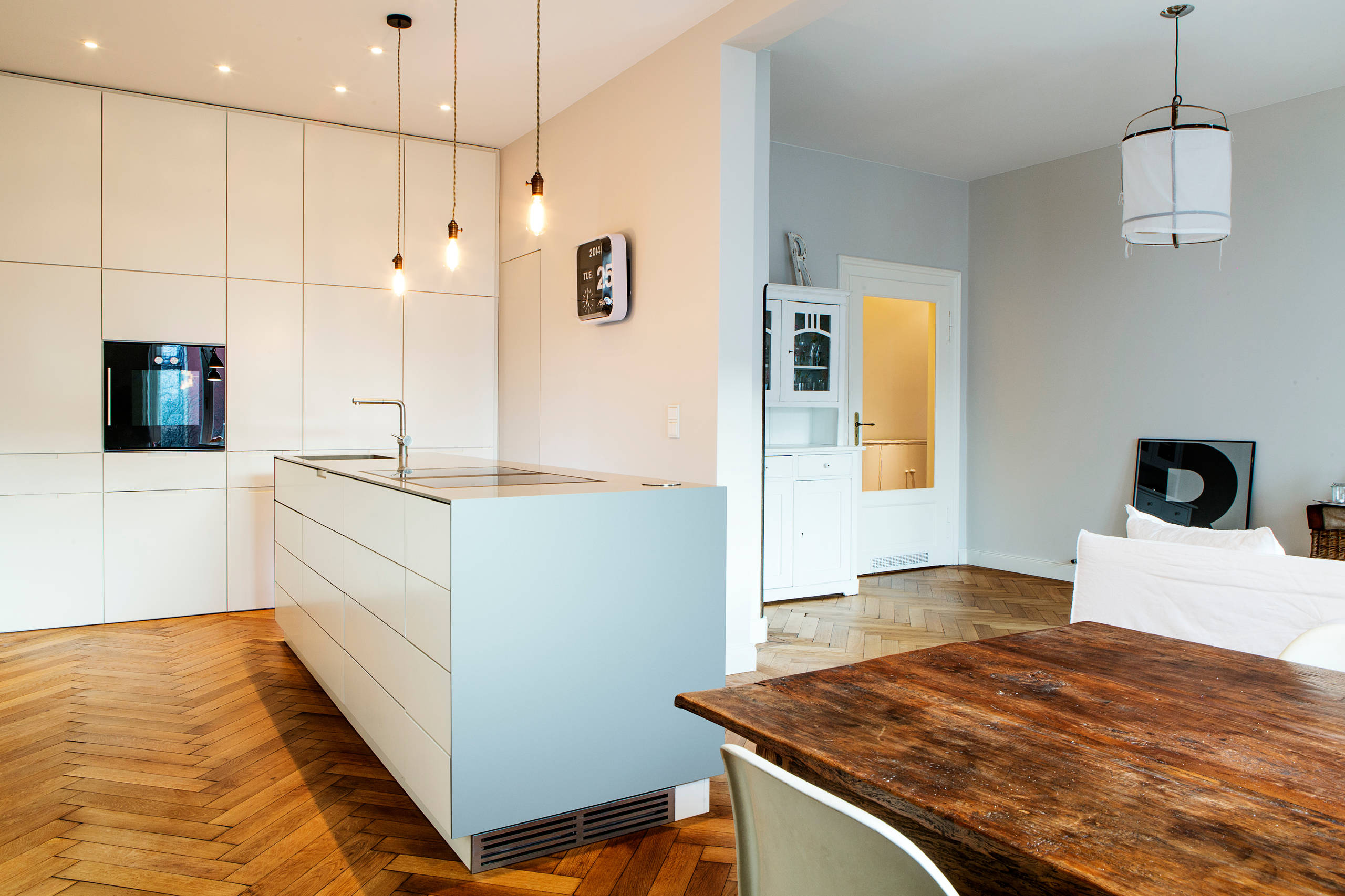 In dieser Altbauwohnung in München wurde der gesamte Grundriss neu geordnet. Dabei hat die Küche an Raum hinzugewonnen, auch weil ein offener Wohn-, Koch- und Essbereich entstanden ist. Auf zwei Räumen sind nun drei Funktionsbereiche untergebracht. Und Platz für eine kleine Speisekammer haben die Macher*innen von Bespoke dabei auch noch gefunden.