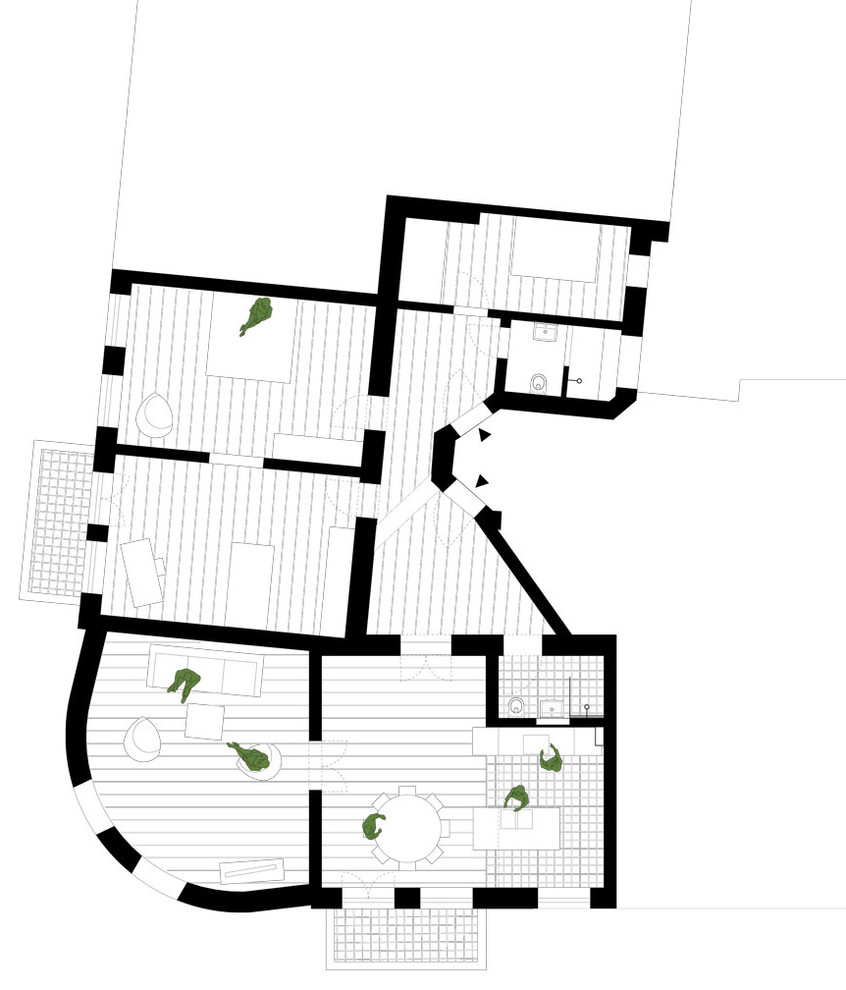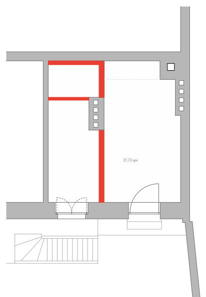 Im Plan rot eingezeichnet sind die Wände der ehemaligen Raumaufteilung.