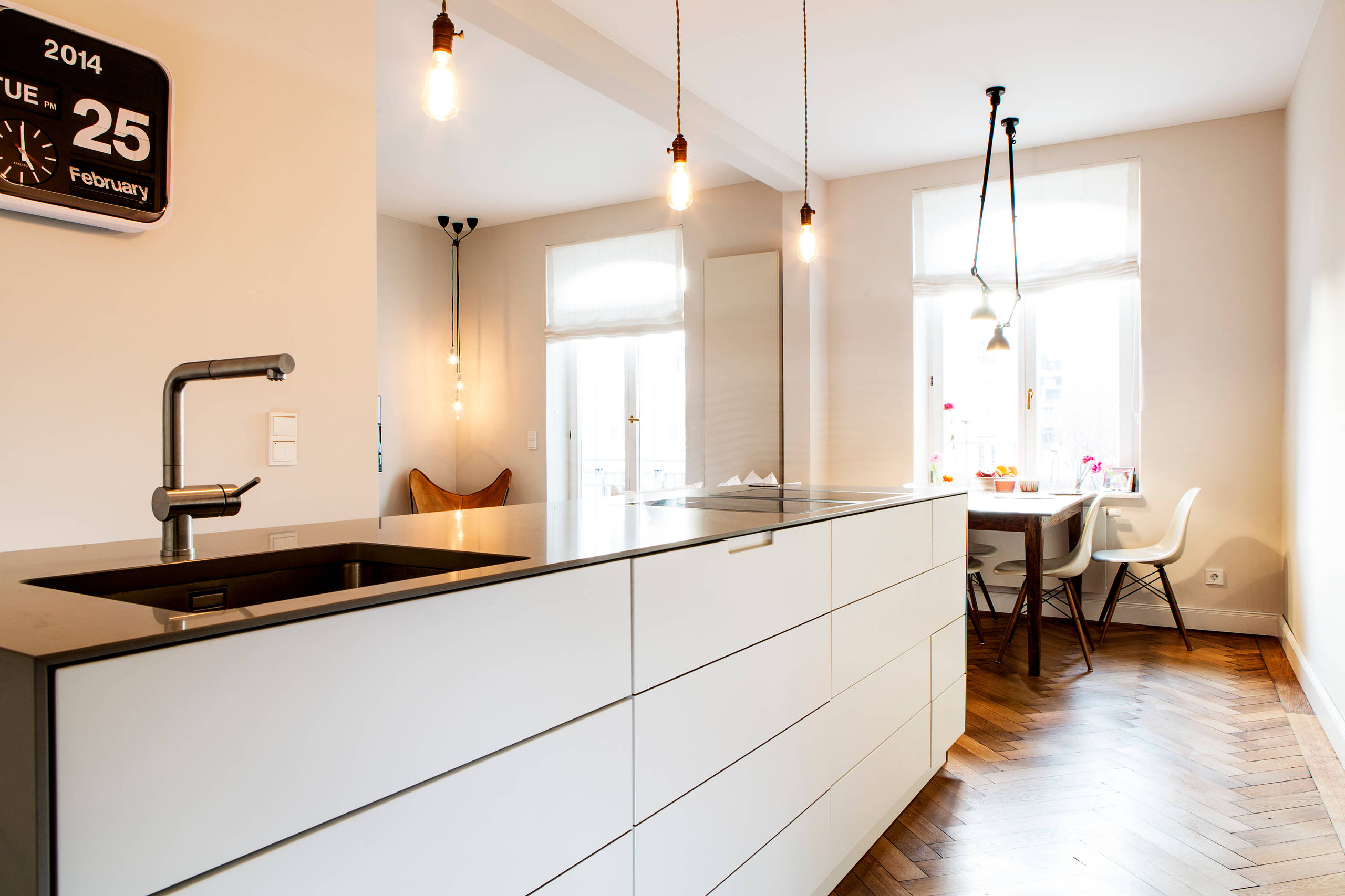 Großzügig hat das Bad Quadratmeter an die Küche abgegeben. Der Hochschrank schiebt sich auf den Platz, der zuvor von Waschbecken und Co. besetzt war. Zudem dehnen sich Kücheninsel und -schränke in den Essbereich aus. Das Team von IFUB* hat dafür beim Umbau der Wohnung in Berlin die ehemals trennende Wand zwischen Küche und Esszimmer einreißen lassen.
