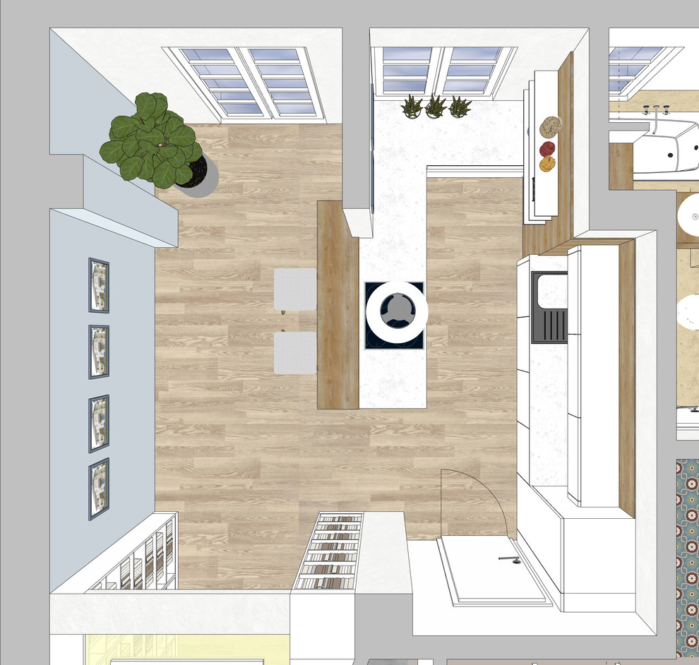 Im Grundriss ist gut zu sehen, wie Küche und Bad aneinanderliegen. Das Bad wurde durch den Umbau zwar kleiner, aber nicht weniger komfortabel.