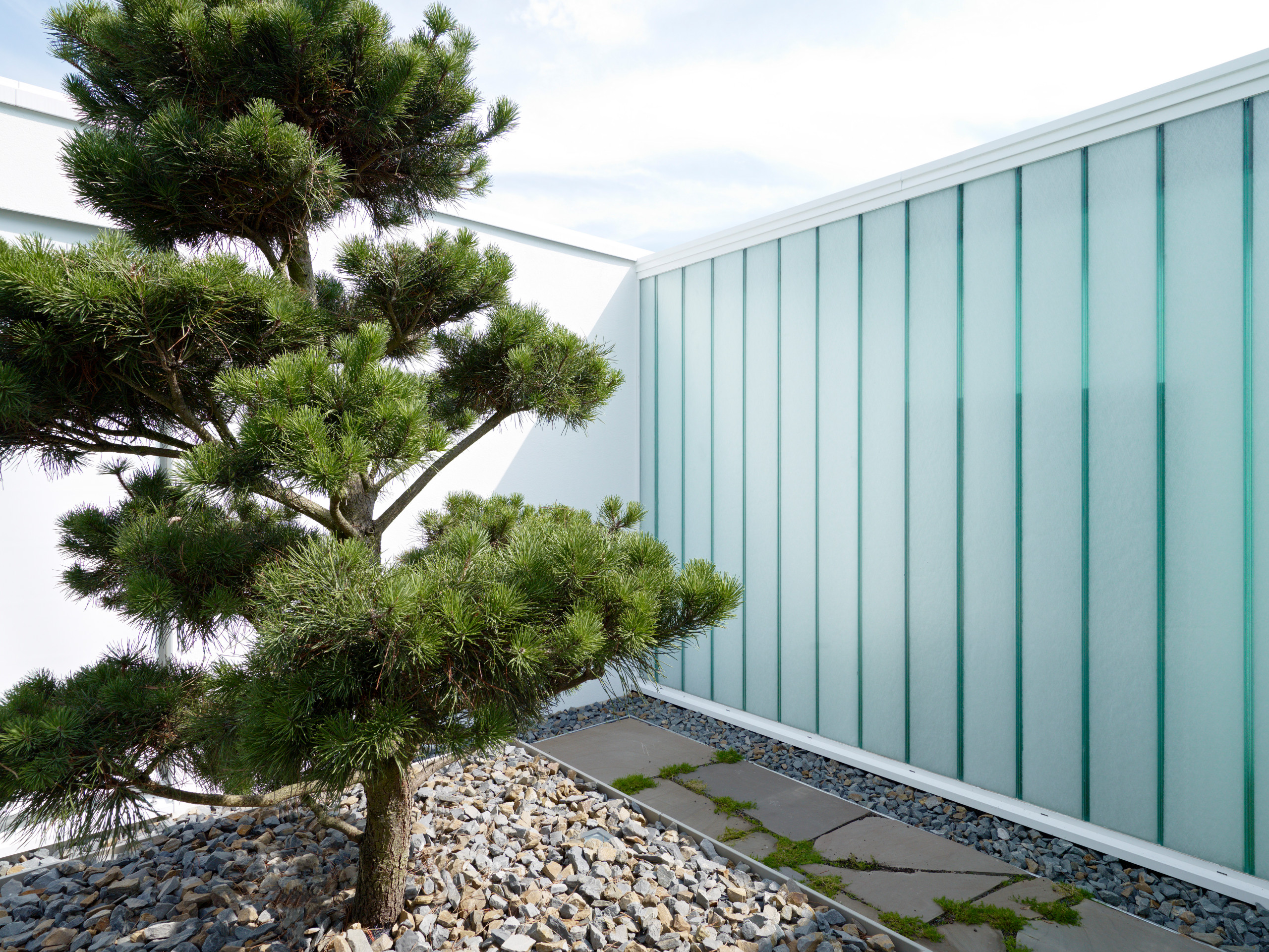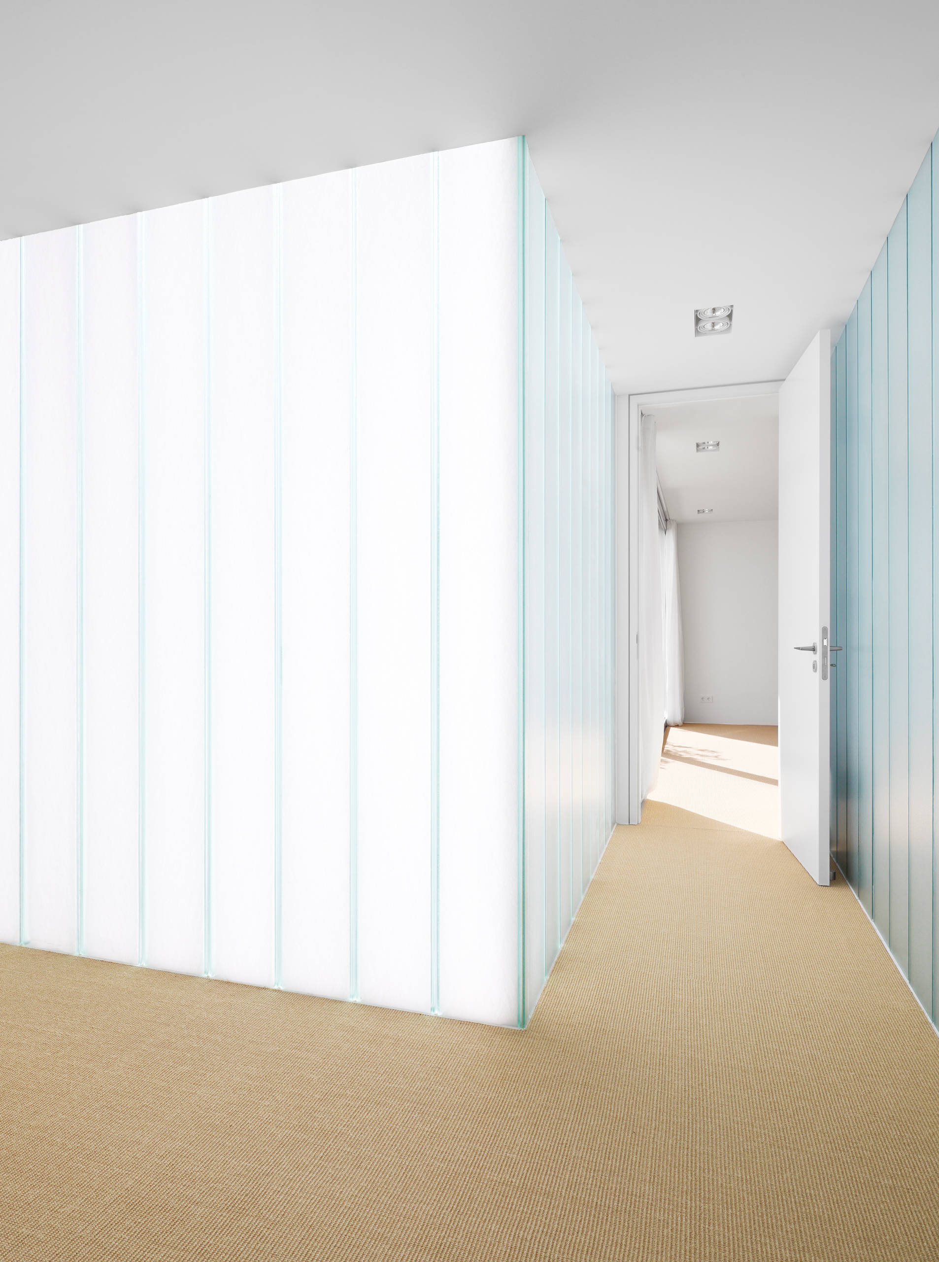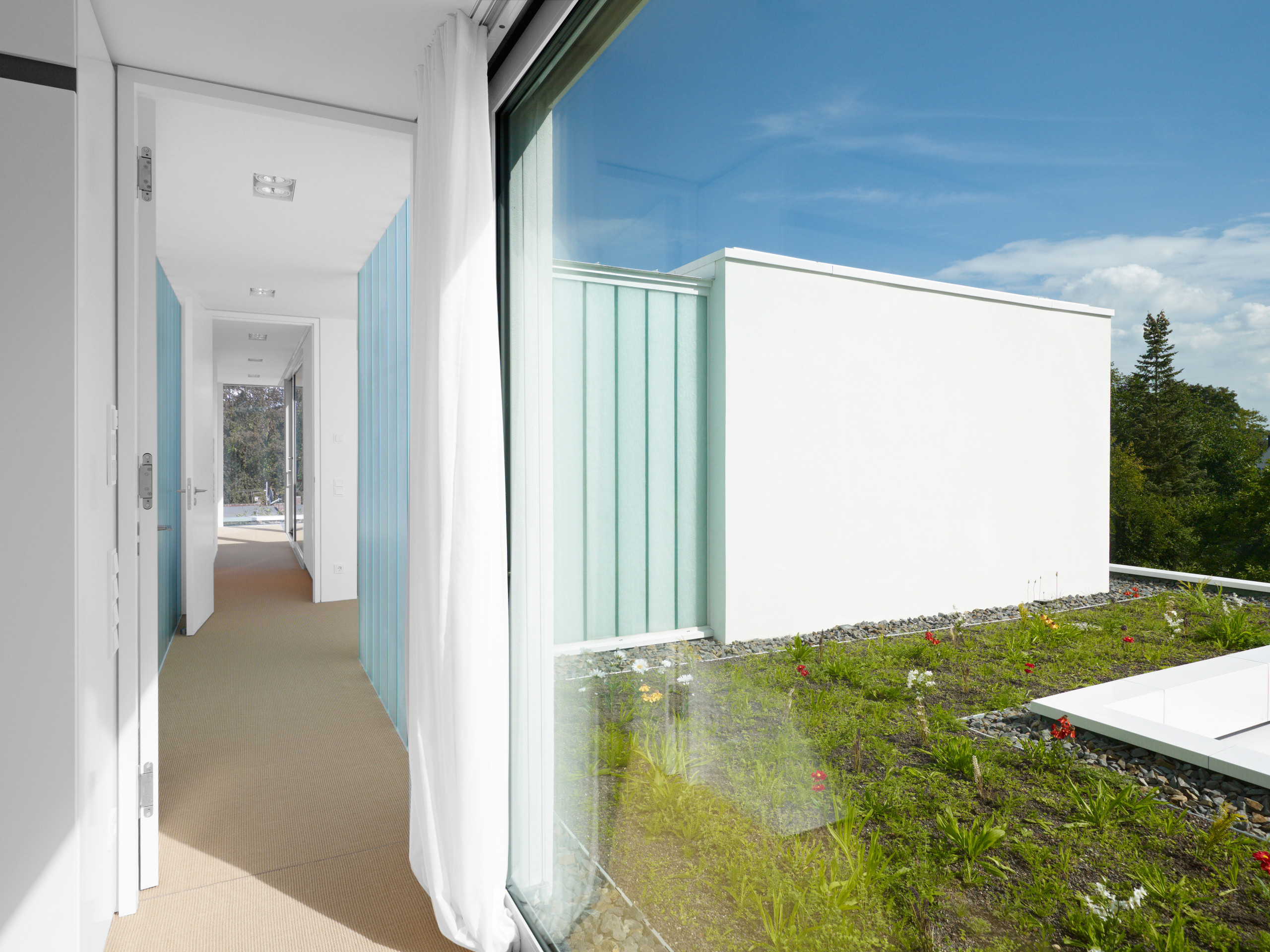 Die drei Boxen sind über Gänge aus Profilbauglas miteinander verbunden. „Dieses Material bietet eine transluzente Wärmedämmung. Ein zusätzlicher Sonnenschutz ist nicht nötig. Zudem herrscht in den Gängen dadurch extrem helles Licht“, berichtet der Architekt. Profilbauglas bietet darüber hinaus ein gutes Verhältnis zwischen Kosten und Qualität. Die Verbindungsgänge sind mit Titanzink-Blech belegt.