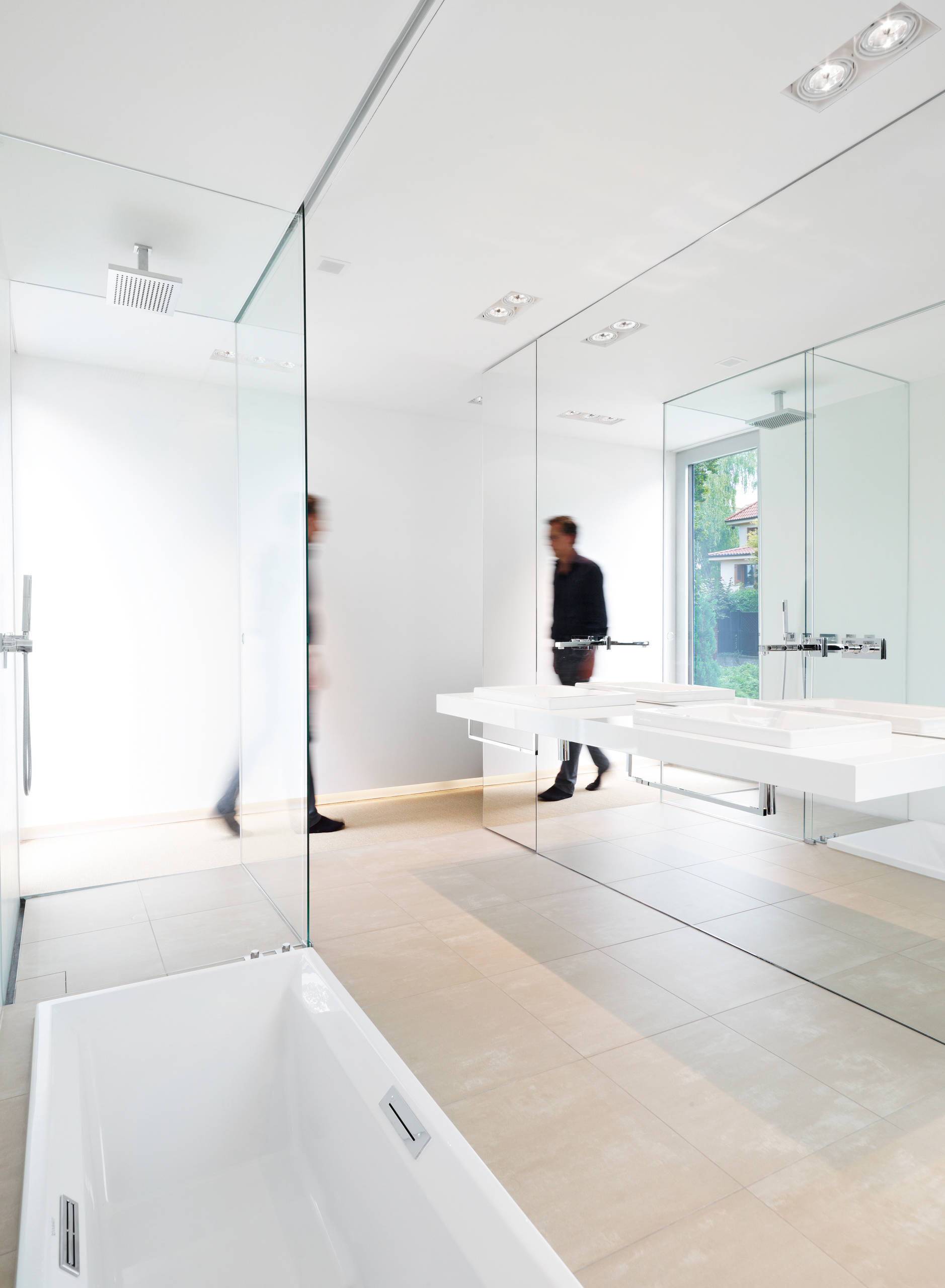 Den hohen Dachaufbau haben die Architekten auch spielerisch eingesetzt. Die Badewanne des Elternbads etwa ist bodengleich darin eingelassen. Um auch von hier einen Blick nach draußen zu haben, ohne jedoch von außen gesehen zu werden, haben die Architekten die Wand hinter dem Waschtisch komplett verspiegelt. Die Spiegel vergrößern den Raum auch optisch. Zudem sind hinter den Spiegelwänden Apothekerauszüge angebracht, die alle im Bad notwendigen Utensilien verbergen. Das Bad ist in derselben Box wie das Elternschlafzimmer und die Ankleide untergebracht. Die beiden anderen Boxen dienen als Wohn- und Arbeitsräume für die Eltern.