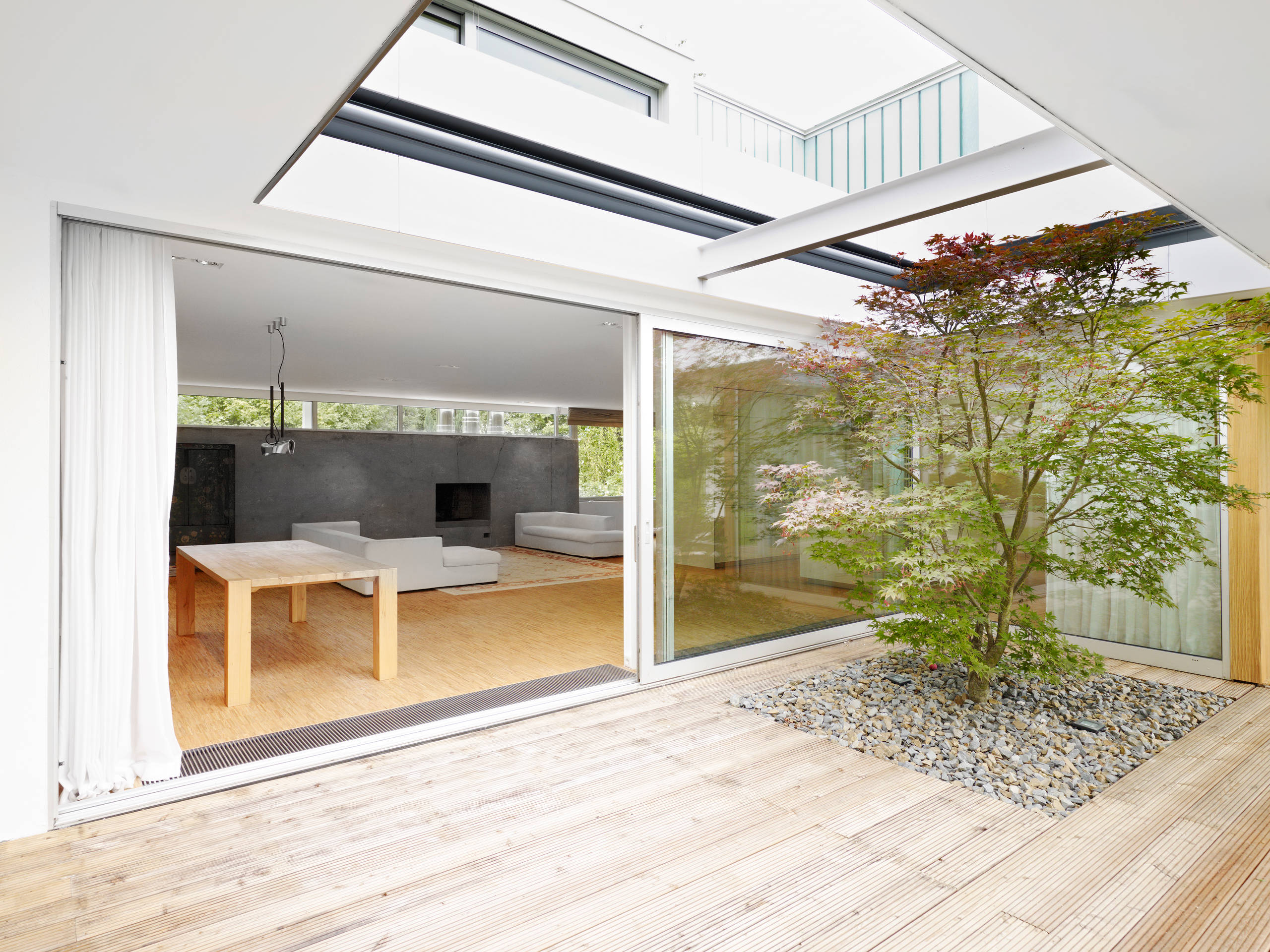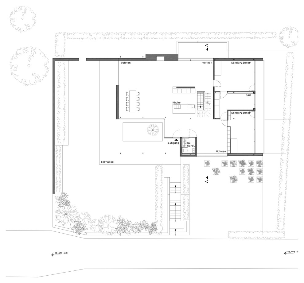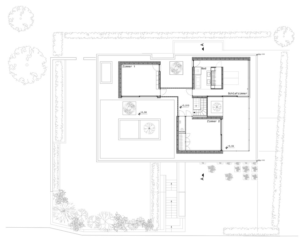 In rund sechzig Zentimeter tiefen Trögen wurden Bäume angepflanzt. Eine Wildblumenwiese umgibt einen Apfelbaum auf der nach Südwesten gelegenen Dachfläche. Sie dient als Schaugarten für die angrenzenden Räume. Eine Magnolie ziert die nach Osten liegende Dachterrasse, die eine leichte, mit Stahlseilen bespannte Stahlkonstruktion als Absturzsicherung hat. Eine Seekiefer versteckt sich in einem nach Norden gelegenen Hof, der mit einer Glasbalustrade umgeben ist.